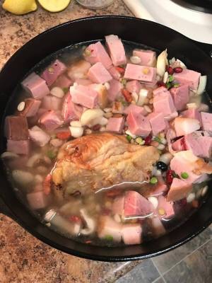 2 Add the cut ham steak, the bones, chicken broth, sliced onion, and 15 bean soup mix all to the Dutch oven. Do not add the tomatoes or the seasoning packet. Add water to help cover what the chicken broth doesn’t.