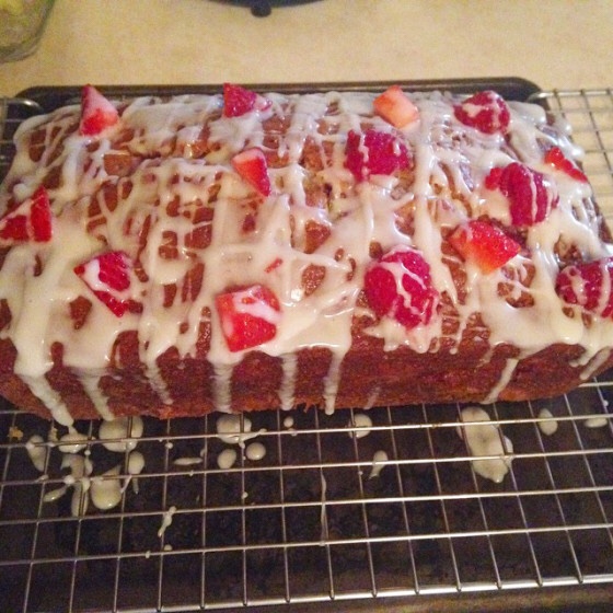 My dad has this guilty pleasure- the frosted fruit bread from Shady Maple. It’s pretty awesome. I was going to make this recipe as muffins, but we didn’t have enough muffin papers sooo I changed my plans a bit and went for the full loaf. I am really missing my summer berries and decided to bite the bullet and just buy some. If I do say so myself….I don’t think we’ll need to spend money to buy this bread anymore! 🙂