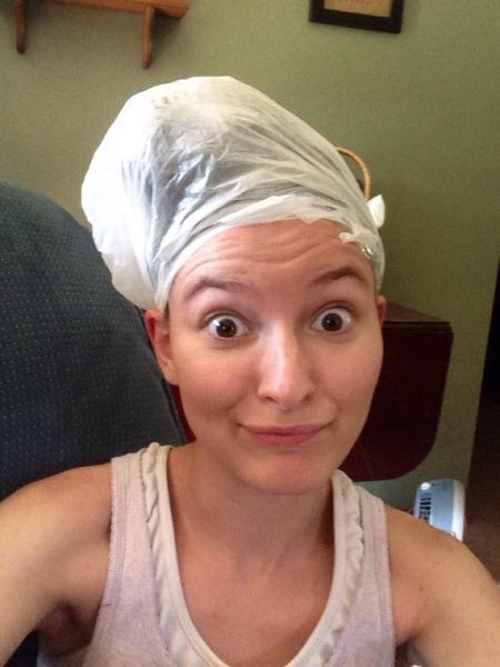 Standing outside, with my rubber gloves on, I flipped my hair upside down and began the application process. My mom grabbed some gloves and helped out a bit as well. I definitely encourage you to find a friend to help with this part. Others bought dye application brushes, and frankly, the mixture is so thick and gritty, it would have taken years to do that to my hair. By applying it with my head upside down, I avoided a lot of issues like the henna falling on to my neck/shoulder and getting on my forehead and ears. Instead of it taking hours to apply like it did for some, it took my mother and I about 15 minutes to coat my hair. I twisted it into a bun on top of my head, and was ready to wait.