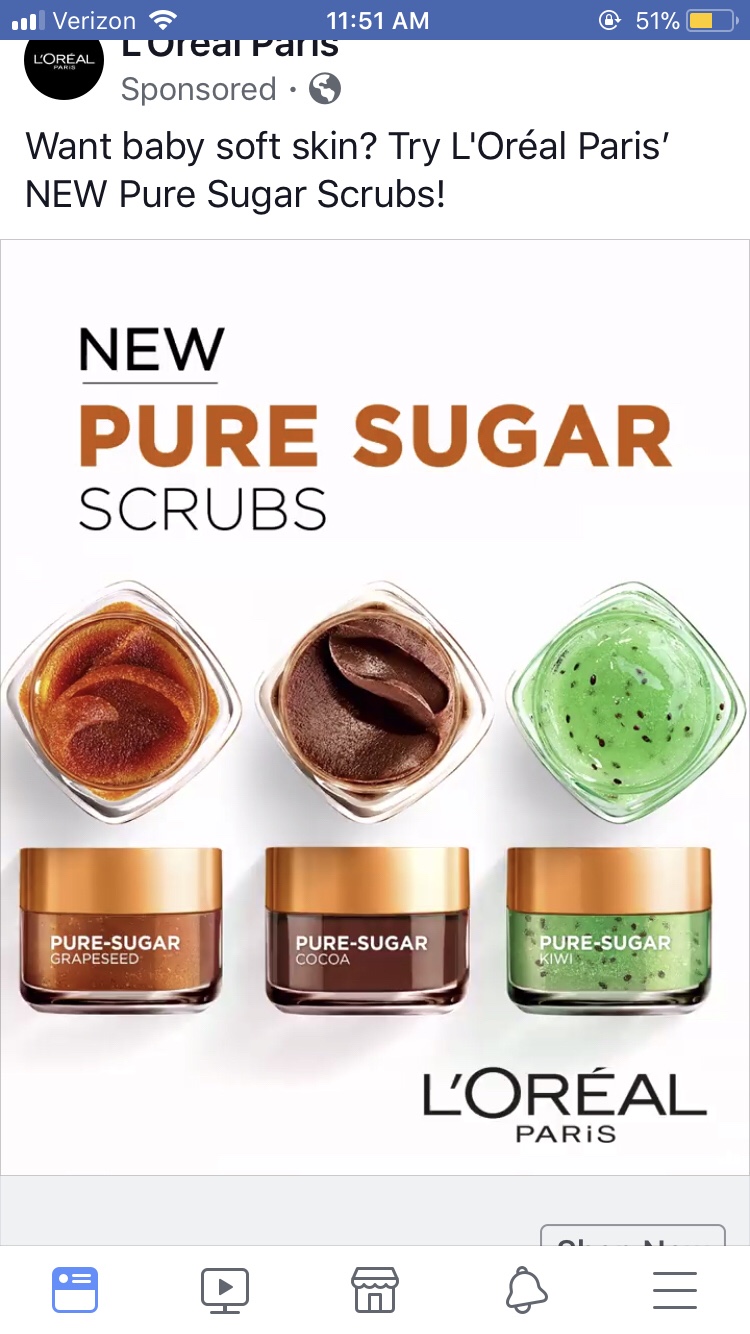 A few weeks ago I did a post on Epsom Salt scrubs/soaks. This week, I’m doing one on sugar scrubs. My inspiration? This ad that I came across on Facebook.