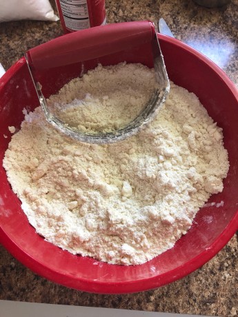 Before adding your milk, I put my drops of Cassia and Ginger in my measuring cup with the milk, to help better distribute the oils. Add the milk and continue to use the crust cutter to help incorporate the milk into the dry ingredients. You still want to see the butter within the dough like the picture below.