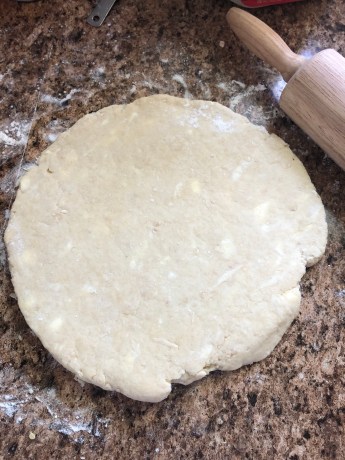 On a lightly floured surface, dump your dough out. It is a fairly dry dough, but it should hold together without an issue. Split in half, form a ball, and gently roll into a circle. The faster you move, and the less you handle the dough and melt the butter, the better! I leave the dough about 1/2 inch thick.