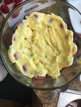 I was able to squeeze 2 full layers before topping with the remaining whipped cream and a few decorative strawberries and blueberries.