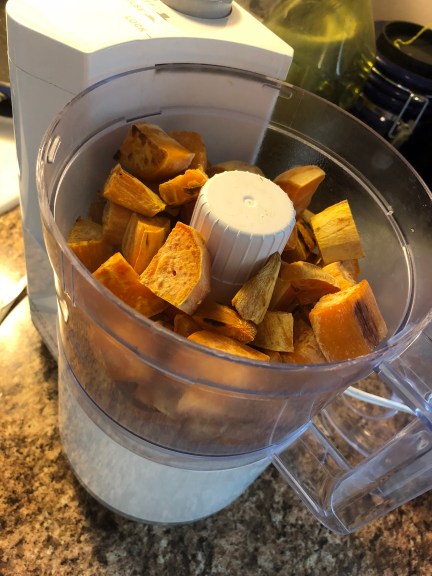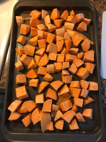 Peel and cube 4 sweet potatoes. These were smaller and just filled the pan. I smooshed a bit of coconut oil on the pan to help prevent sticking. I baked at 400 for about 25 min.