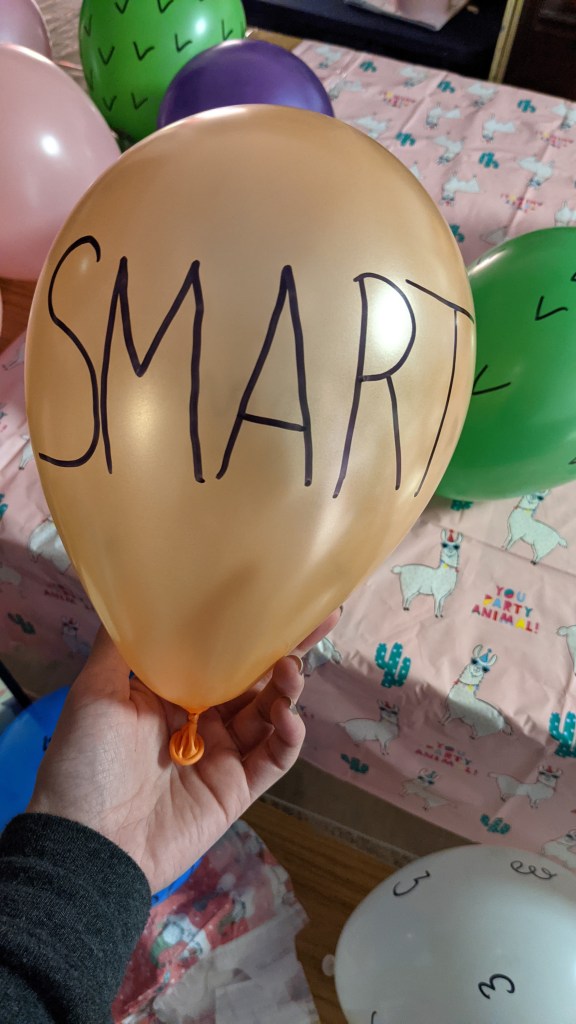 Friday night, I blew up a bunch of balloons and tossed them in her room for the morning. On a few of them I wrote some of her best qualities: sweet, kind, loving, & smart. Compassionate was just took look. I also def haven’t blown up balloons in a long time and will be purchasing a balloon tank for future burthdays.