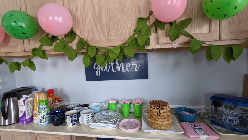 Due to aforementioned parking and schedules, we more or less ended up with 3 parties. As Ethan’s family is 4 doors down-no joke, they were able to come for the first shift 10-12. We made waffles & frosting, along with my chocolate chip cookies, coffee, and had a semblance of birthday brunch-ish.