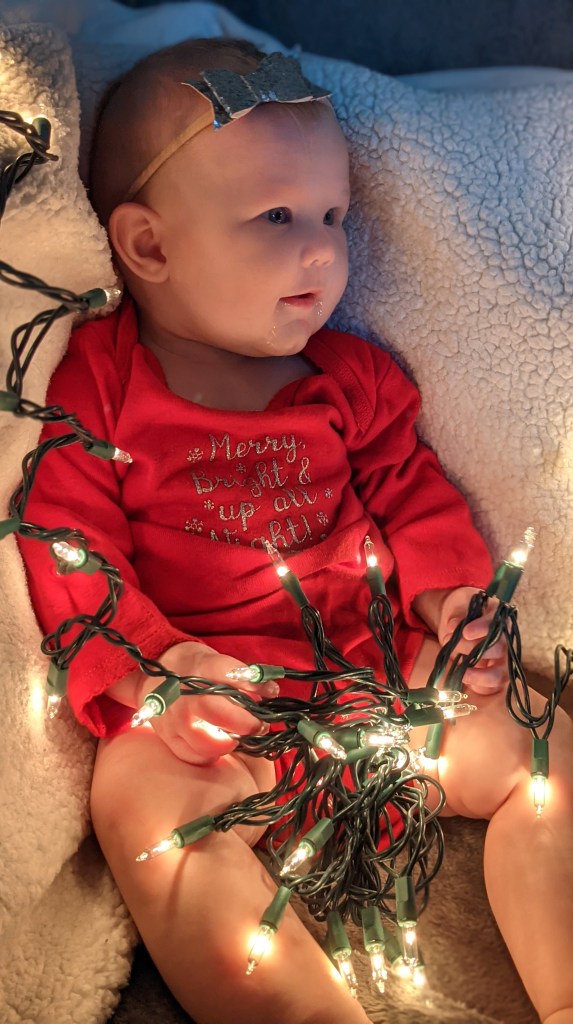 Ethan helped me get some Christmas pictures of Eleanor done. When Athena was 1, I did a little photoshoot in her red onesie and white Christmas light. Eleanor, at almost 5m is wearing 12m clothes. I wasn’t going to be able to wait til next Christmas so we did them this year!