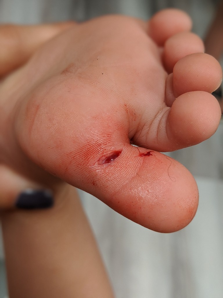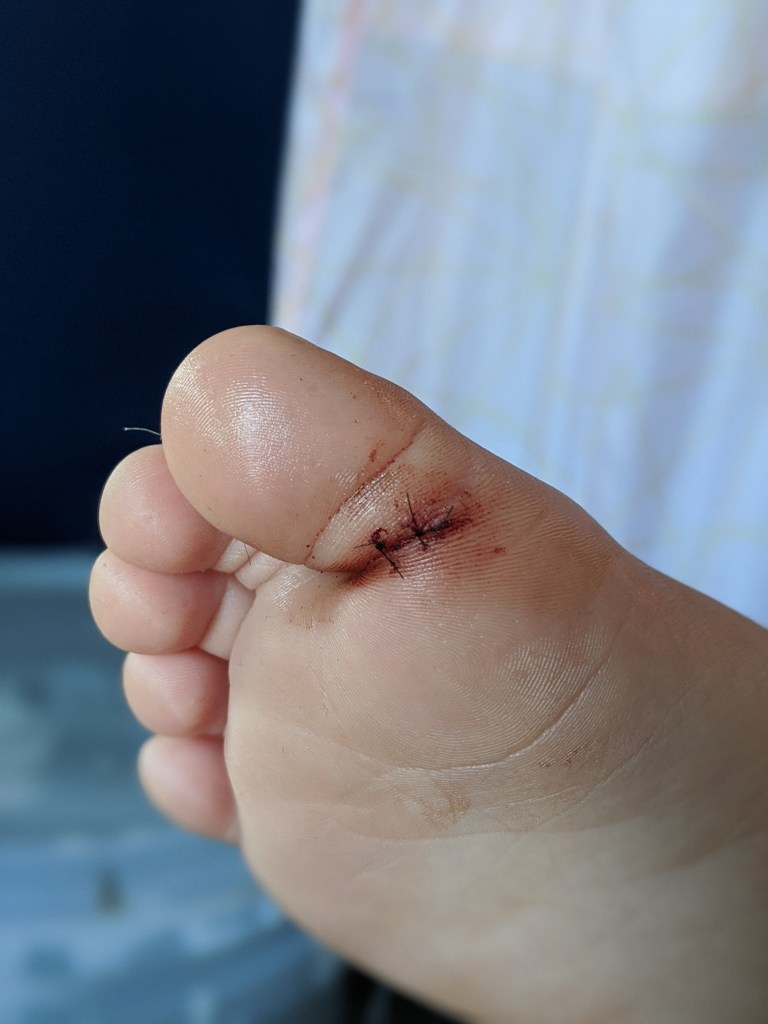 This Spring Athena was in the livingroom playing. Ethan was sitting on the couch attentively watching and playing with her. I walked out of the livingroom to pee; I was about 9m pregnant. She was next to the couch at her play kitchen. She walked over to Ethan, held up her foot, and said, “Daddy, hurt. Blood.” At which point Ethan goes, “Anna, she cut herself. There’s a lot of blood. Like, a lot.” I’m typically a “rub some dirt in it” kind of parent, but a 2 second evaluation and I immediately knew she was going to need stitches. Any deeper and it would have hit tendon and been an ER trip instead of urgent care. 2 stitches, and she didn’t cry until he stuck her with the needle to numb the area. If you aren’t squeamish, scroll to the second pic.