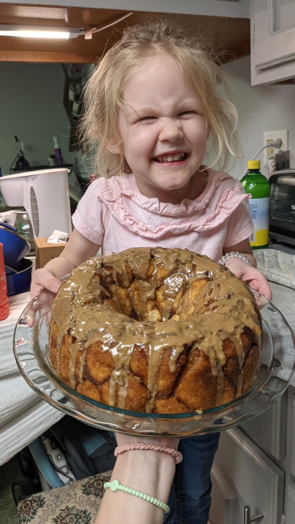 Athena has been watching through Kids Baking Championship and thus we have been doing a LOT of baking. As you can see above, she is extremely proud of the monkey bread she helped make.
