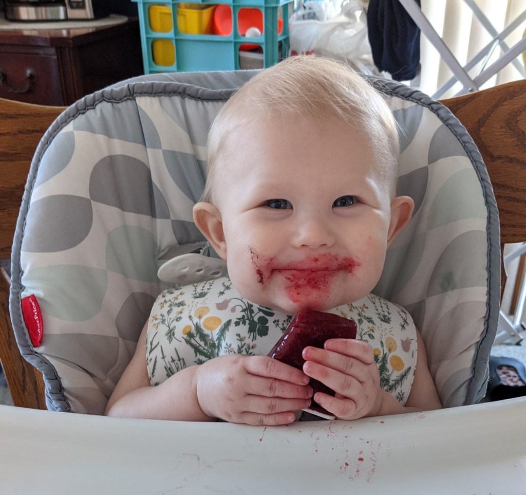 Nora has been starting to play with berries and seems to be loving them! She rolls like a champ, does some scooting, and desperately just wants to walk and be mobile.