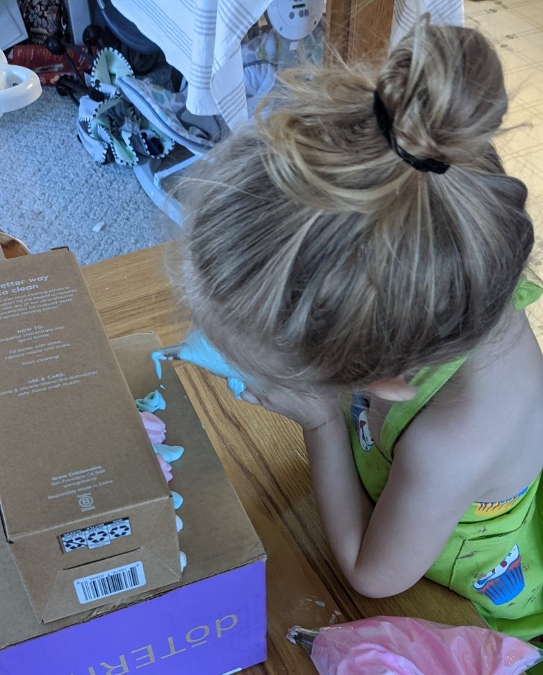 The best part, this was ridiculously easy to clean up. At the end of our adventure we simply pulled the tips and tossed everything out. As this puffy paint does actually dry, you could let your child’s cake dry. When it does, it retains a bit of bounce. Our child has 0 chill so saving that particular activity was not really an option, but I’m hoping one of her future “cakes” will make the cut!