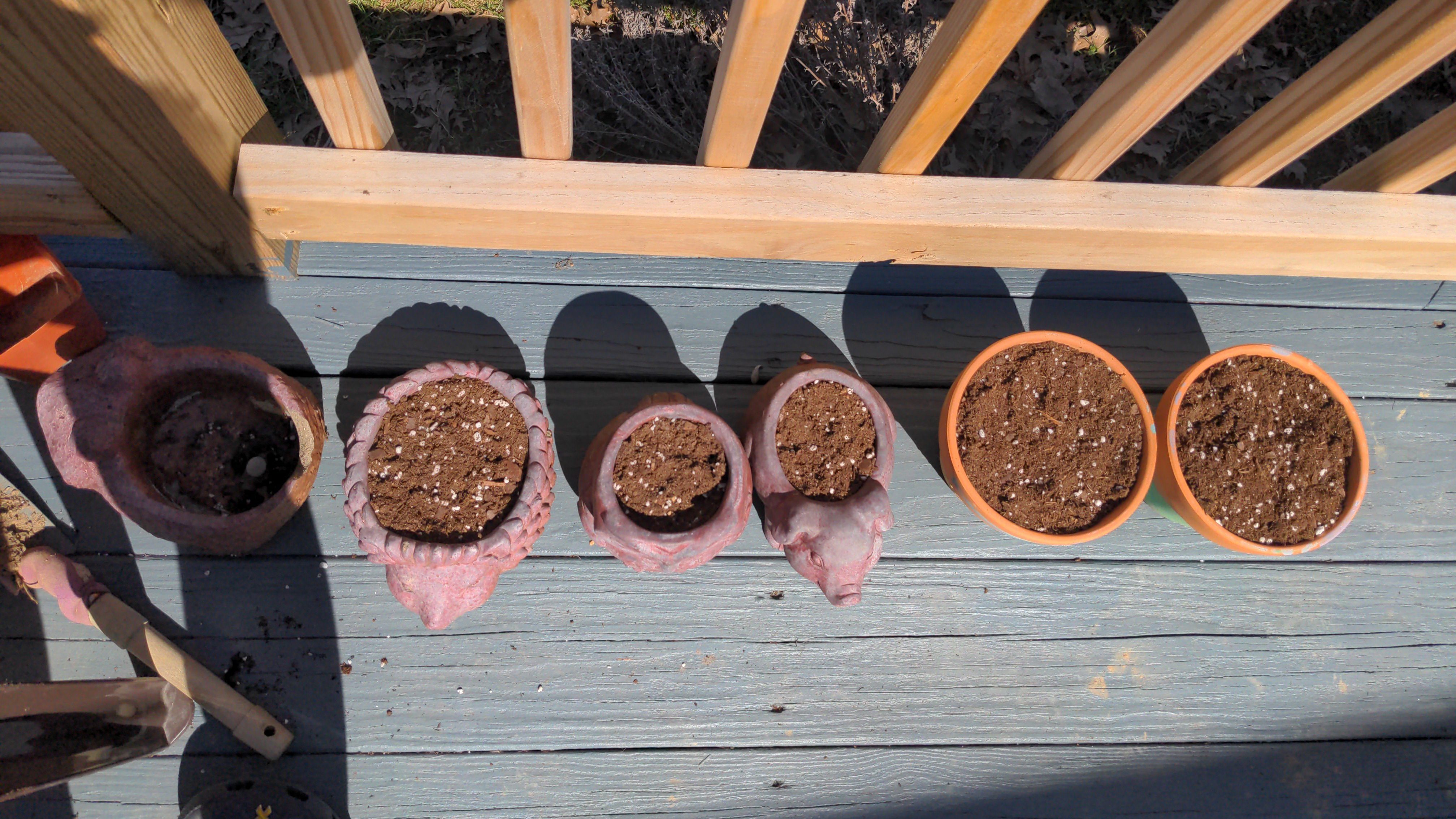 Last but not least, we “planted” some Marigolds. I use the term loosely as we did not water them, which means they are still dormant. Last Spring Athena painted a collection of terra cotta pots. My parents also hooked us up with a menagerie of animal pots. The animal pots with Crackerjack Marigolds will go in our awkward square space betwixt the deck, driveway, porch, and walkway. I am planting Snow in Summer as a low ground cover to fill the space, keep weeds down, and contrast the bright Marigolds popping out.