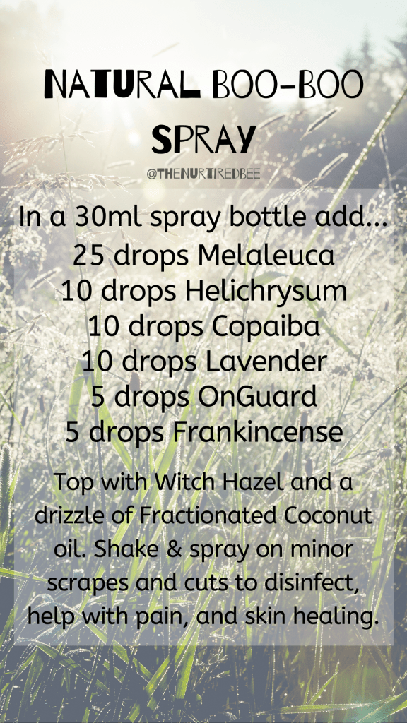 Back in my day, my mama used to douse me in Bactine. It stung like the dickens. A few years ago, I created my own version. Funny enough, I feel like it does kind of smell like Bactine. Each oil has an explicit purpose in this mix. Melaleuca (Tea Tree) is cleansing. Helichrysum can help stop bleeding. Copaiba is great for pain and skin healing. Lavender has its own analgesic properties. OnGuard helps clean, and has analgesic powers. Frankincense helps amplify all of them, along with anti-inflammatory. I have used this spray on many scraped knees in the last 2 years.