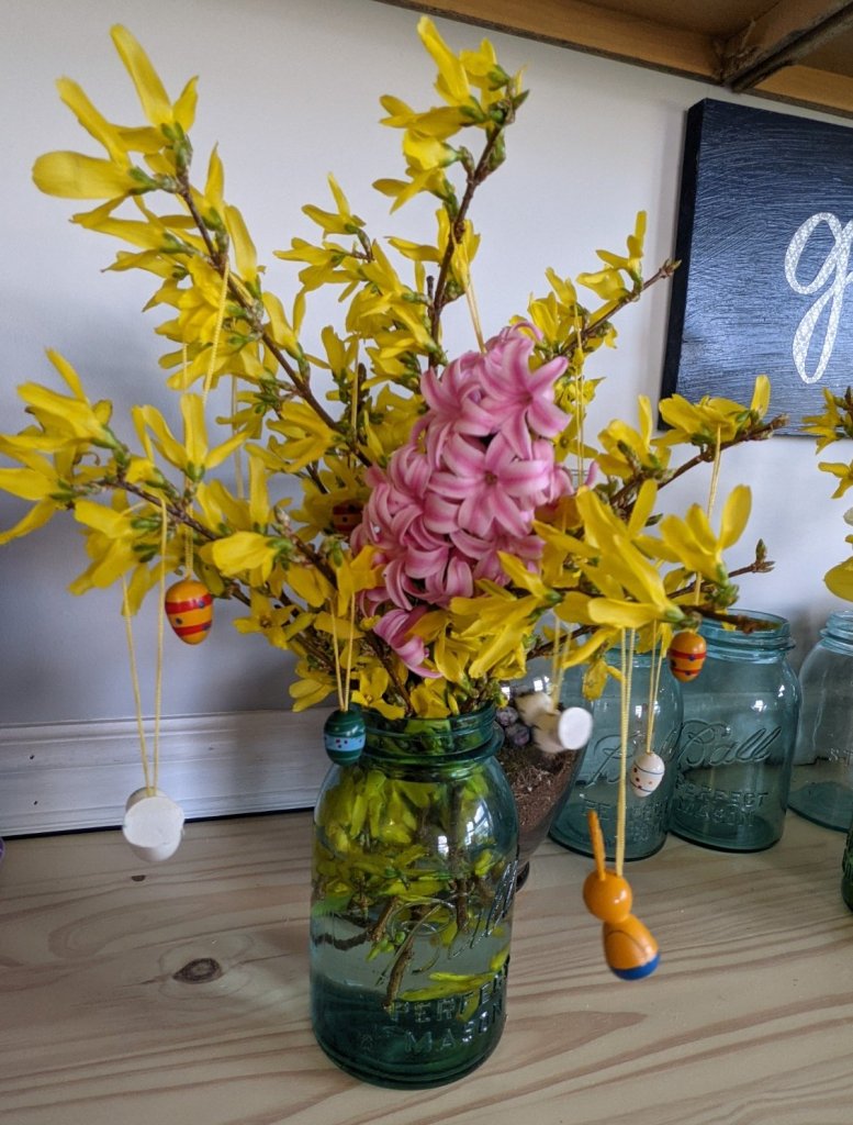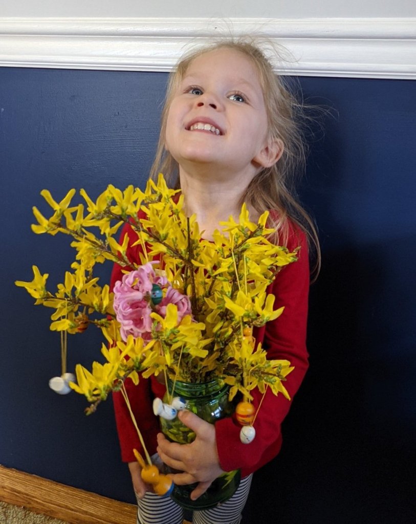 In Germany, these Easter Trees exist both indoors and out! As Forsythia is typically in bloom for Easter and we have giant bushes of it, it’s my go-to. I also think it’s exceptionally fitting that it is part of the olive family.