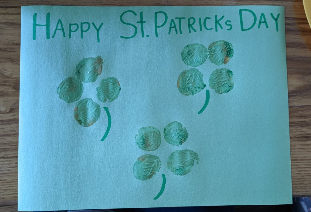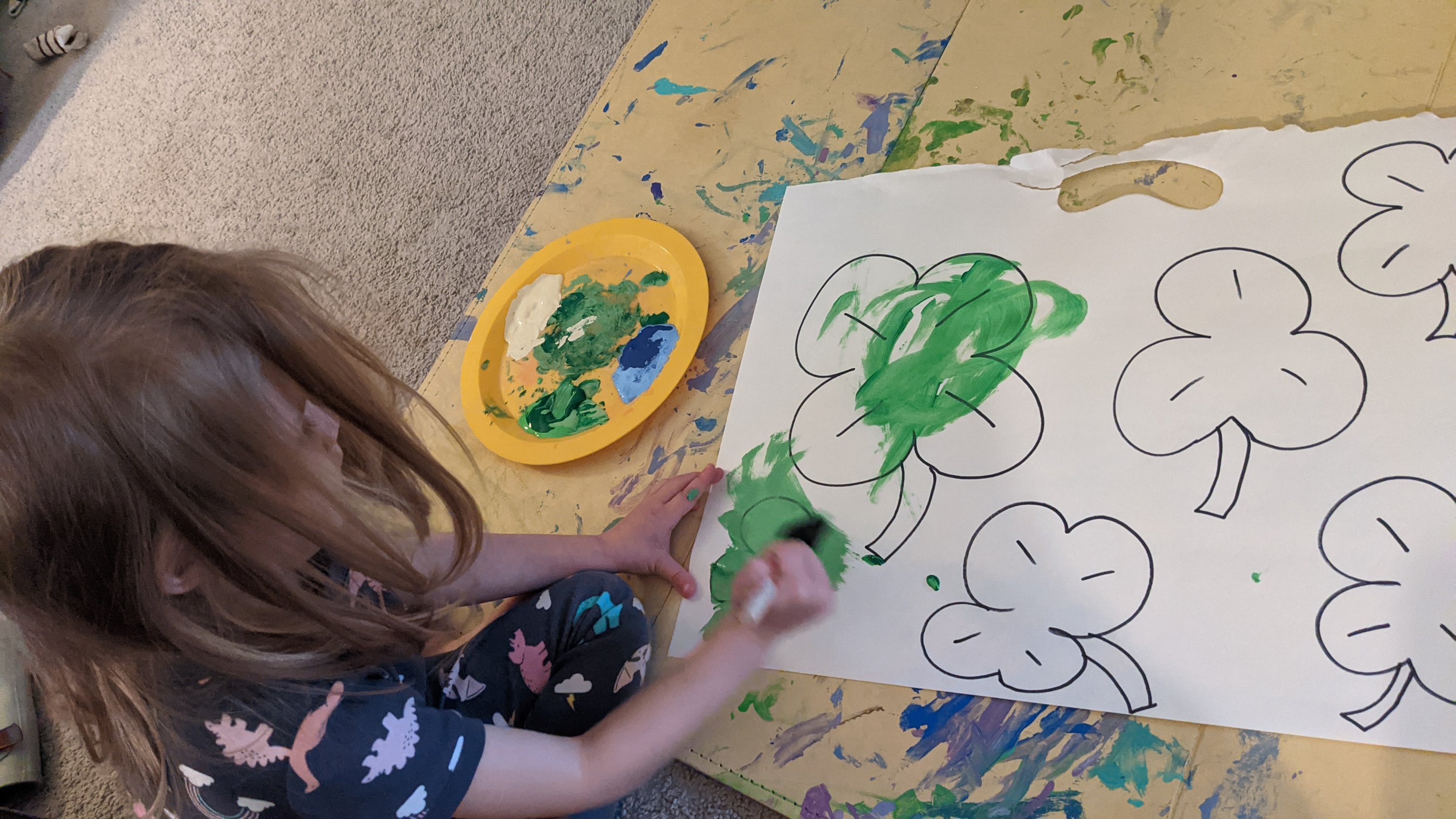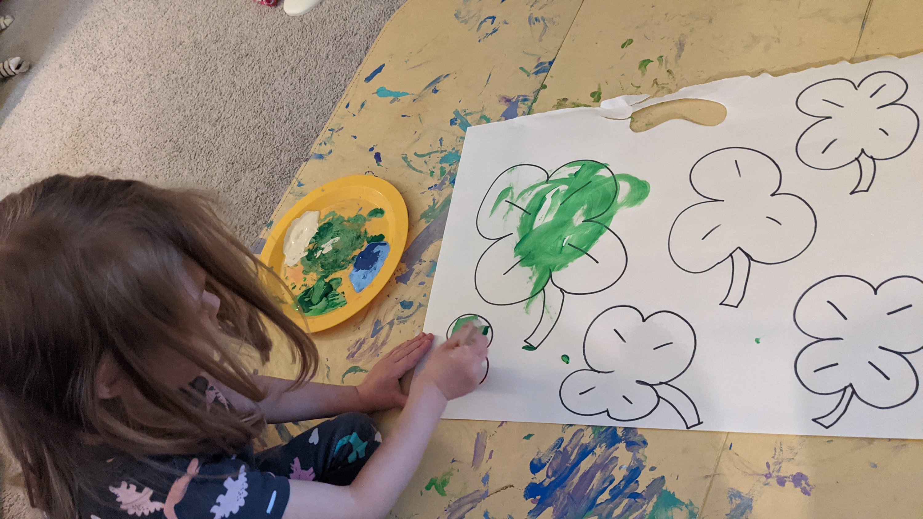 Ethan has been working from home and I’ve been going crazy coming up with ways to keep Athena busy and semi-quiet ish. I drew some shamrocks on her giant paper, gave her some paint, and let her go to town.