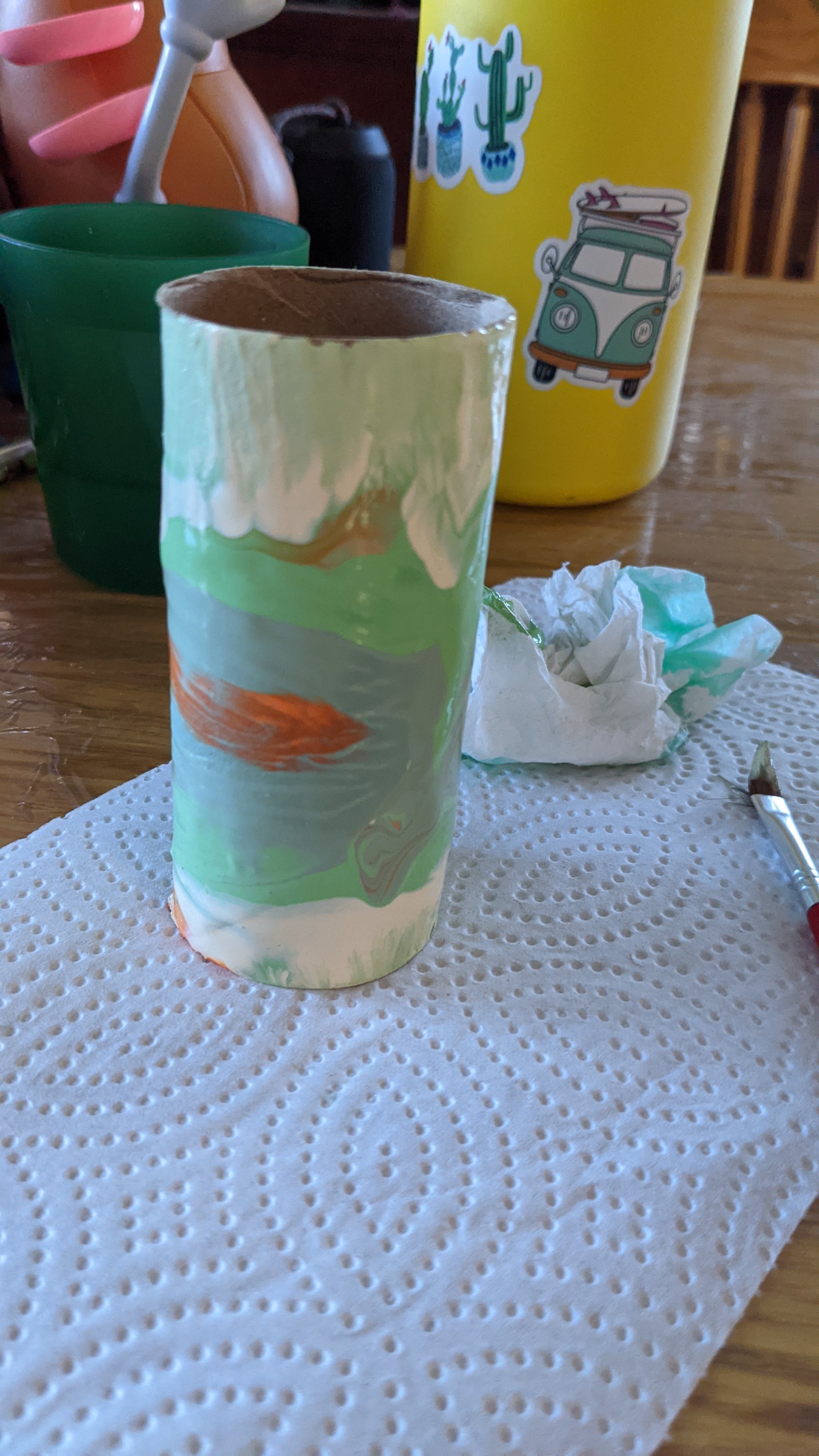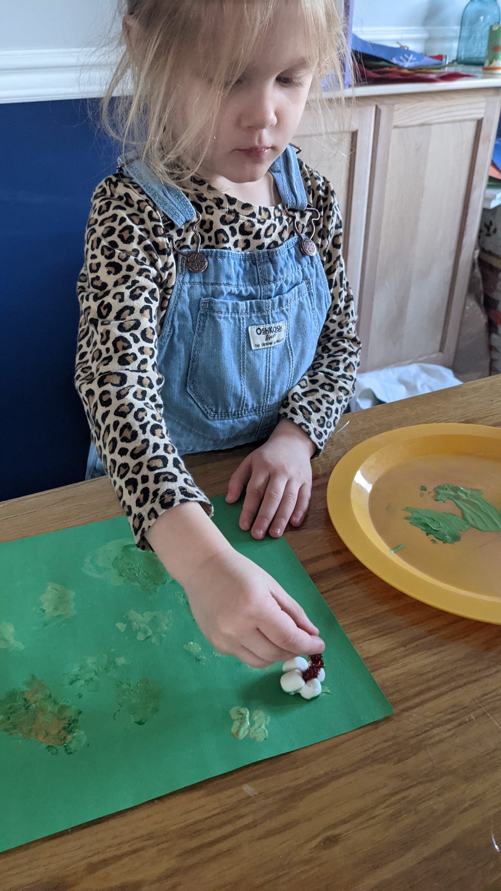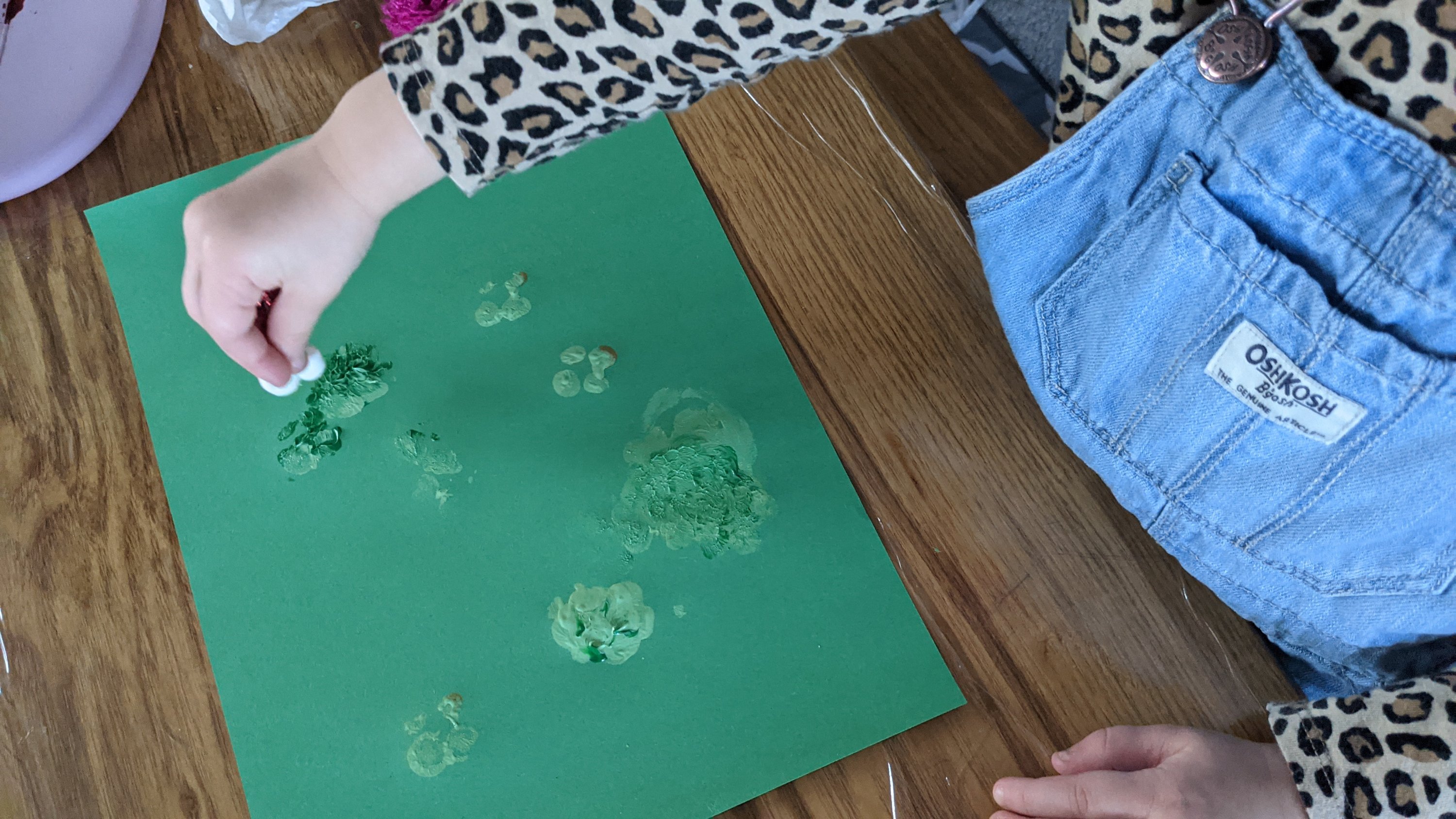 Ethan has been working from home and I’ve been going crazy coming up with ways to keep Athena busy and semi-quiet ish. I drew some shamrocks on her giant paper, gave her some paint, and let her go to town.