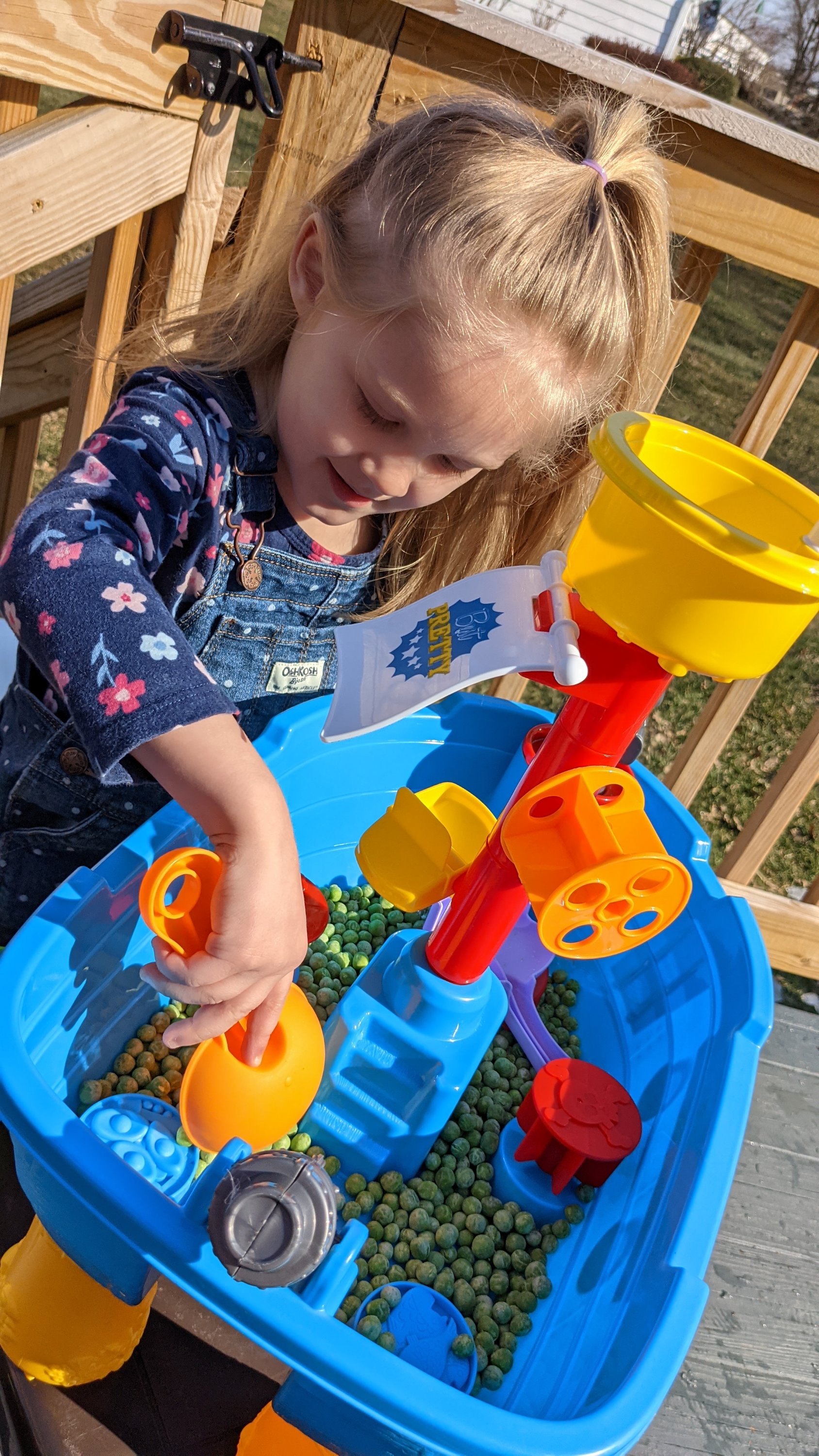 We got the girls a little water table for extra outside play this year. As the we had a week of nicer weather, I took advantage. I picked up a bag of frozen peas and made it a sensory activity! Athena had a blast playing with her new water table, the peas are obviously green, and the frozen added an additionally fun element! When we were done, we dumped the peas at the back of the property for the birds.