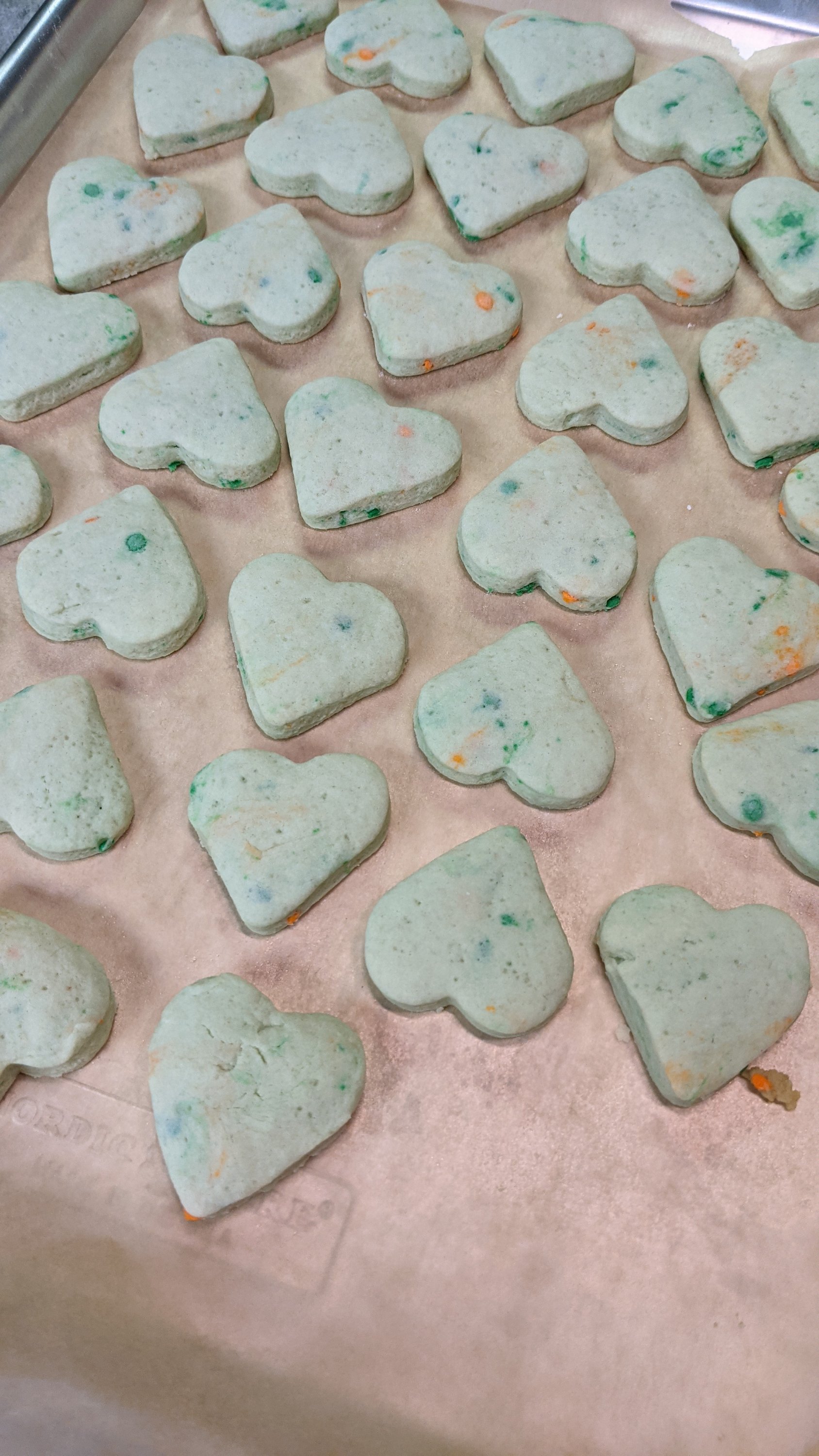 We are still on a mad baking kick around this place. We are also hard-core poop potty training. We made green sugar cookies with green and orange sprinkles as poop-rewards. We have a set of great cookie cutters that are about 2 bites worth. The perfect size.