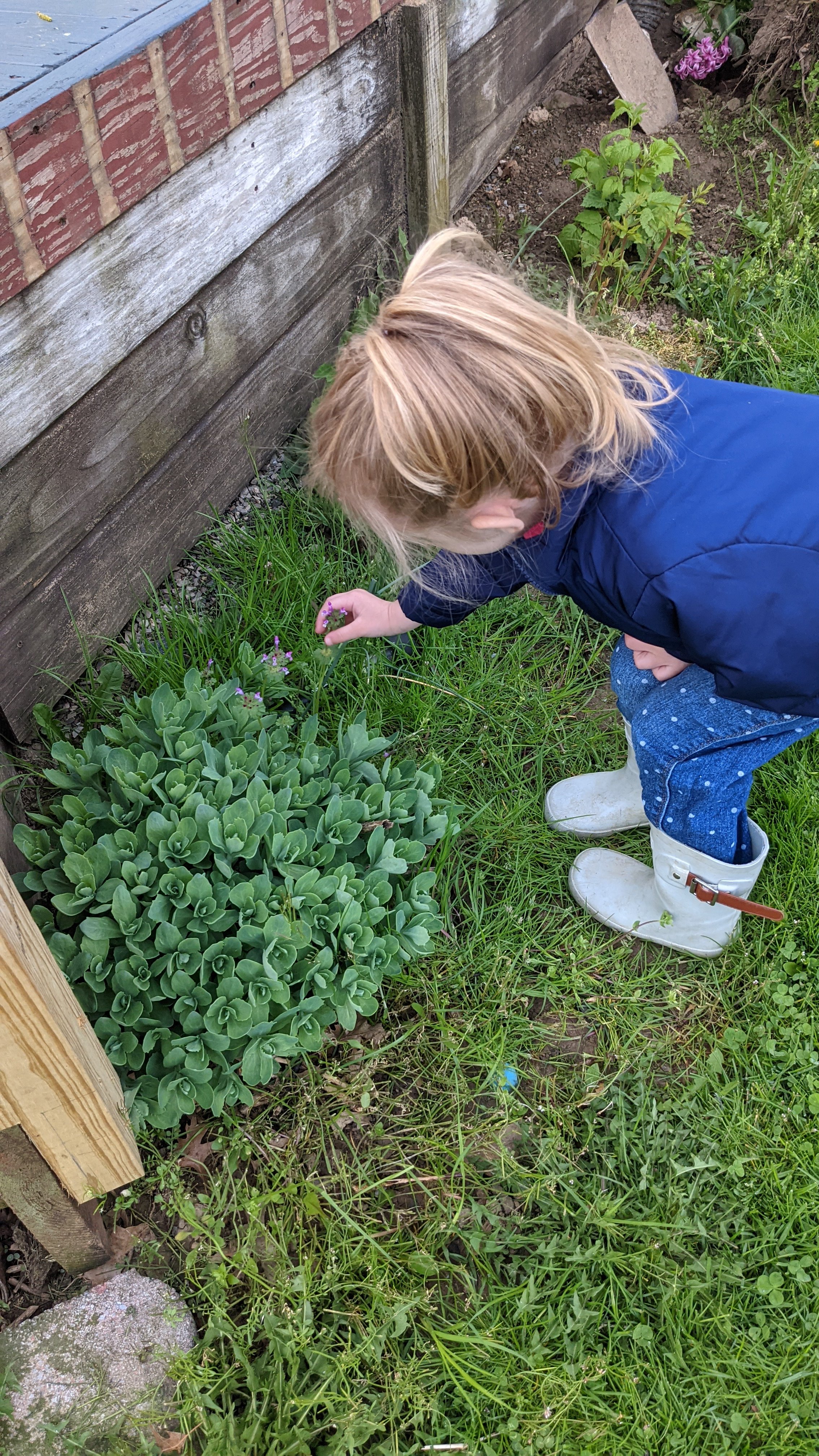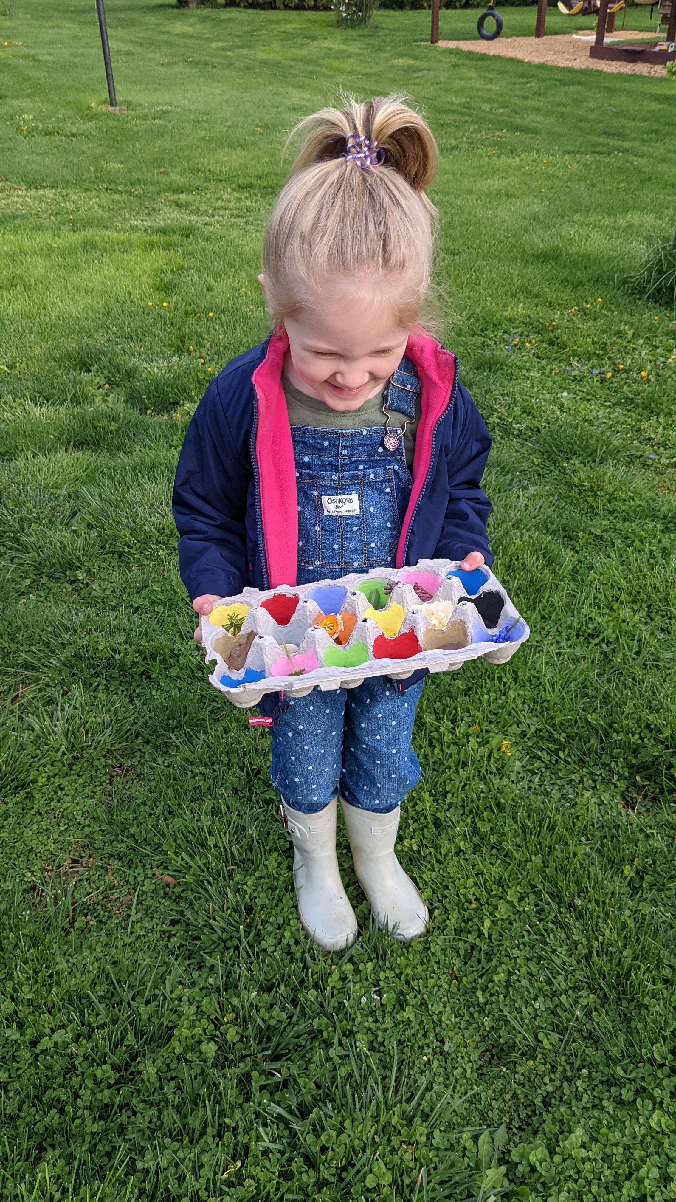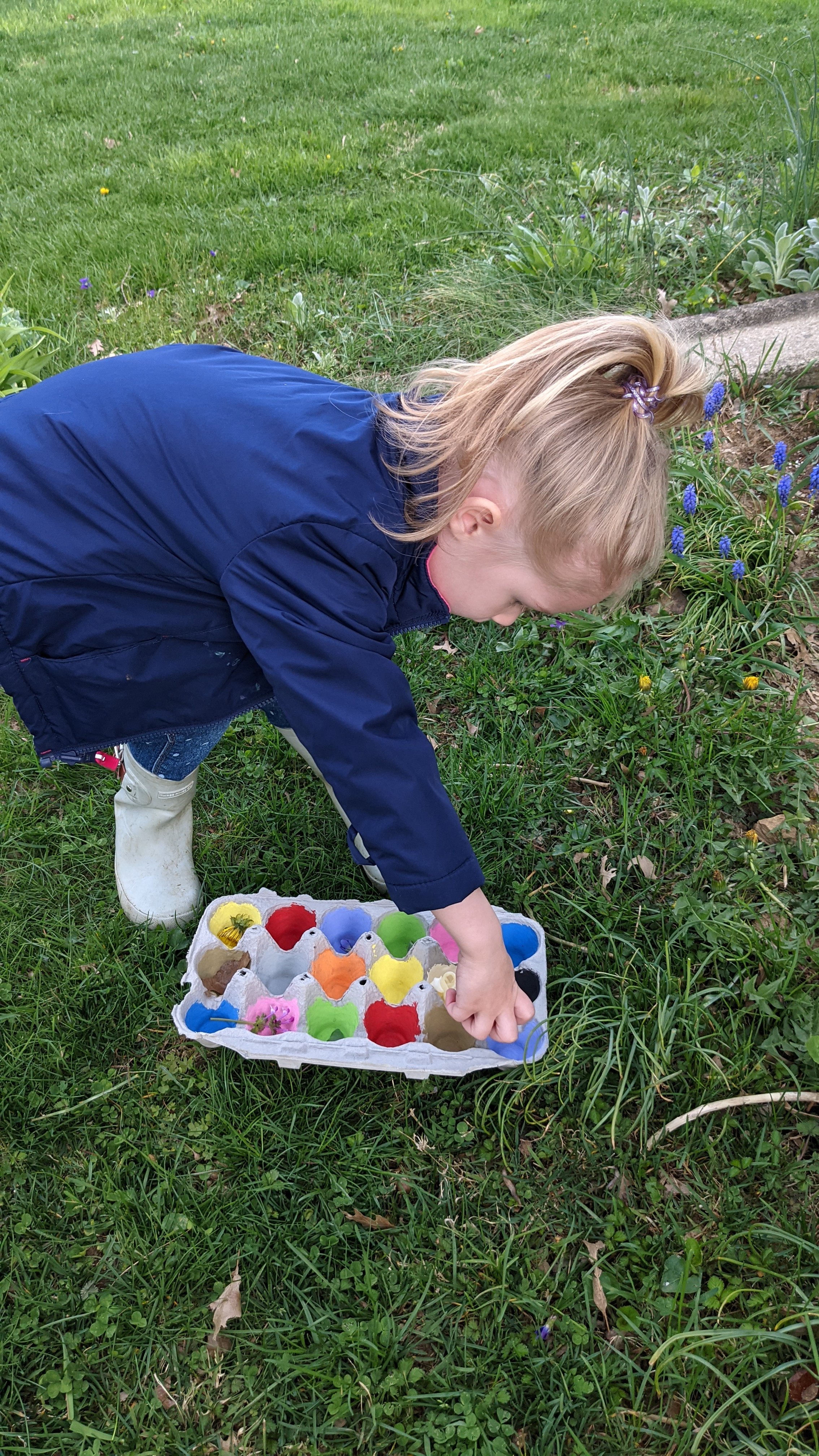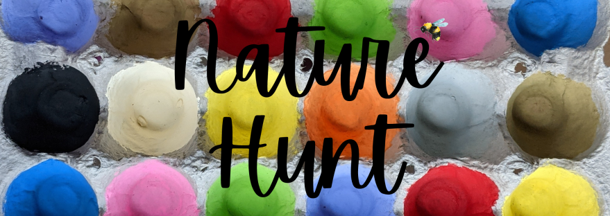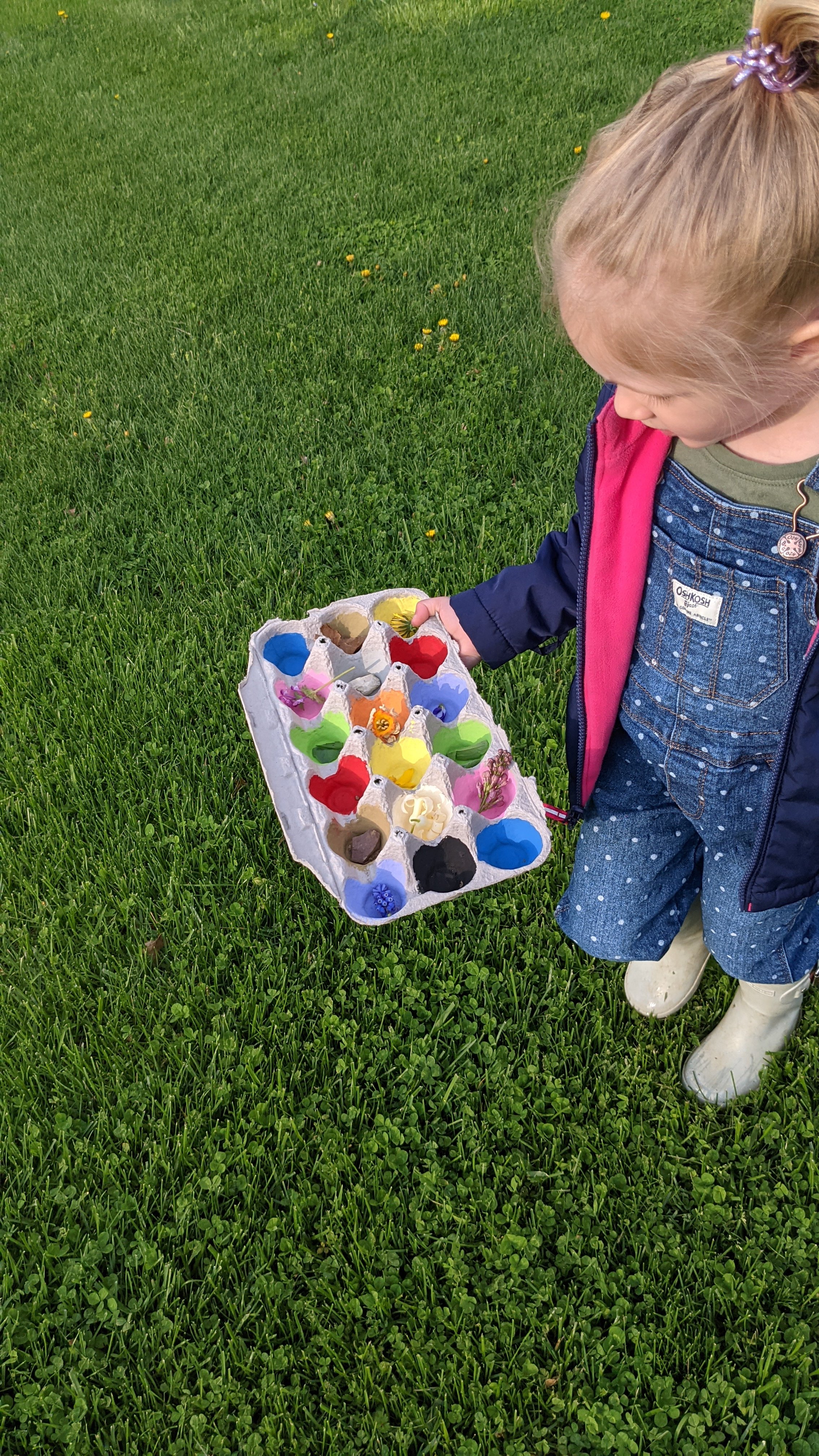 Go outside, and HUNT! Athena had a ton of fun looking around our yard for pieces of nature to put in her Nature Hunt Collector. Along the way not only did we discuss the colors but the names of what she was finding.