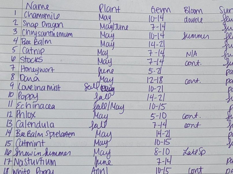 After creating my list, I have a column for sun needs, approximate plant/start time, and about when they bloom. I do this on a spread sheet so I can manipulate as needed. For example, Ethan’s grandmother has her front beds planted so that the flowers bloom in waves. She has SOMETHING blooming from early spring straight on through. If that is something you are considering, you can organize your plant list by “bloom” to decide how you want to plant.
