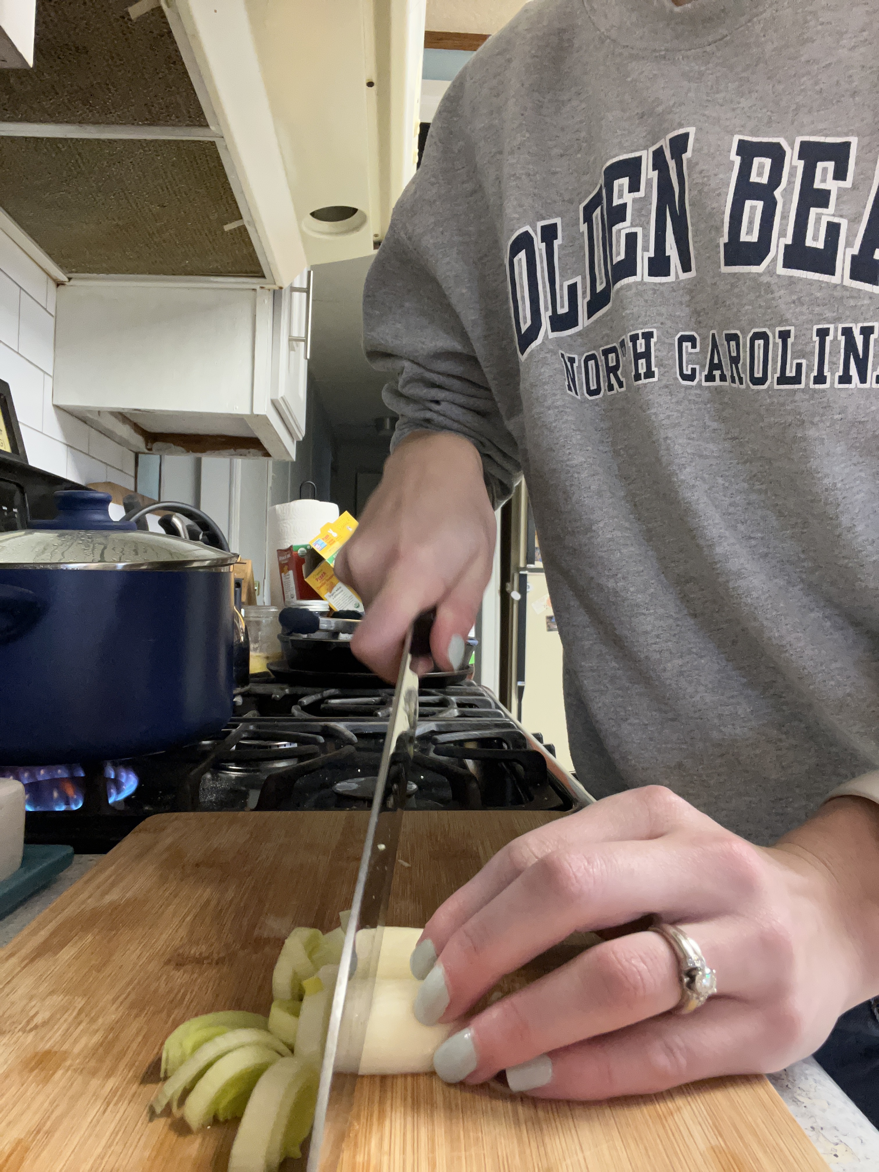 1. I cooked all of my bacon in the pot. After removing the bacon I drained almost all of the fat. While it was cooking, I rinsed and chopped my leeks.