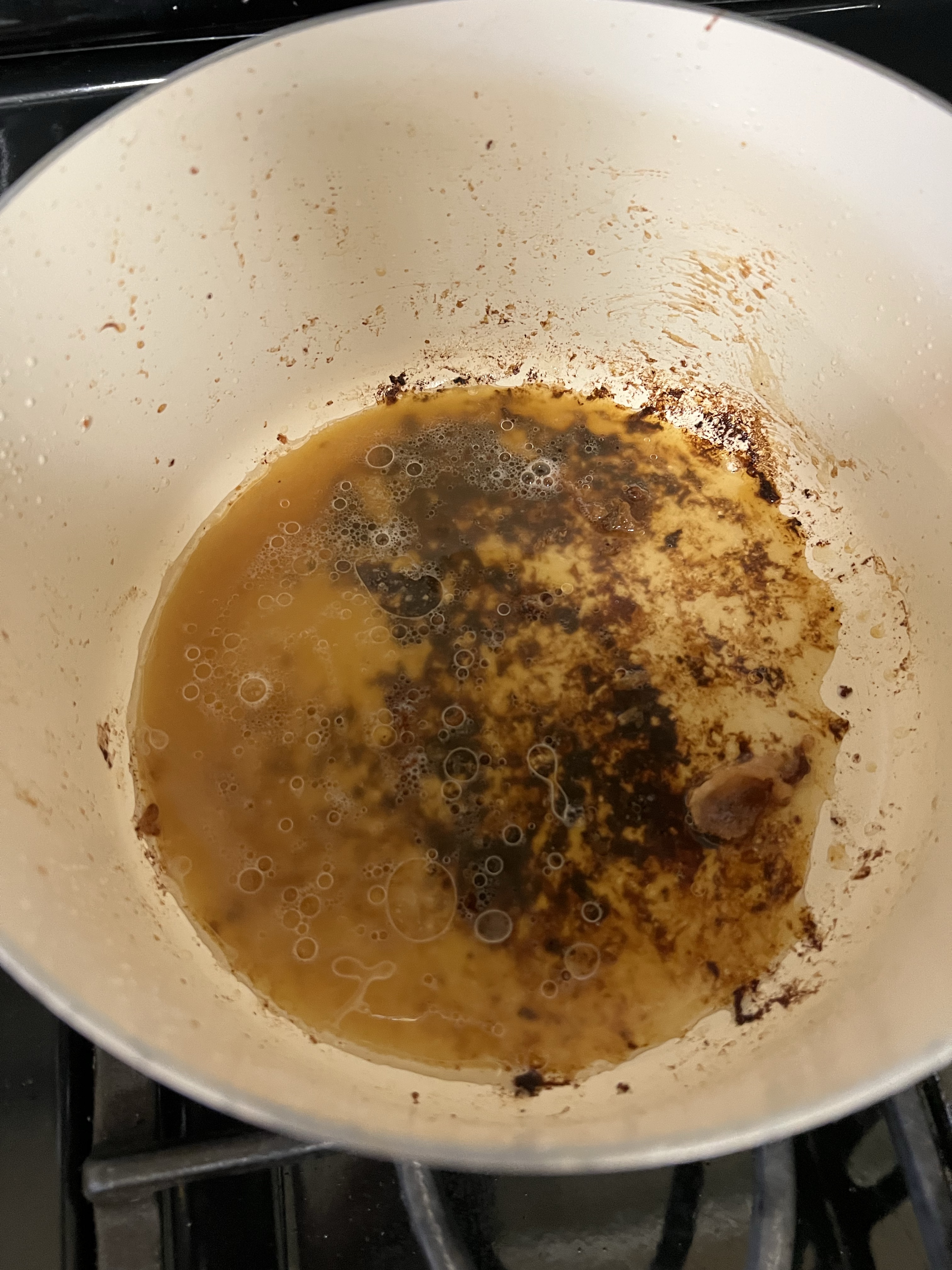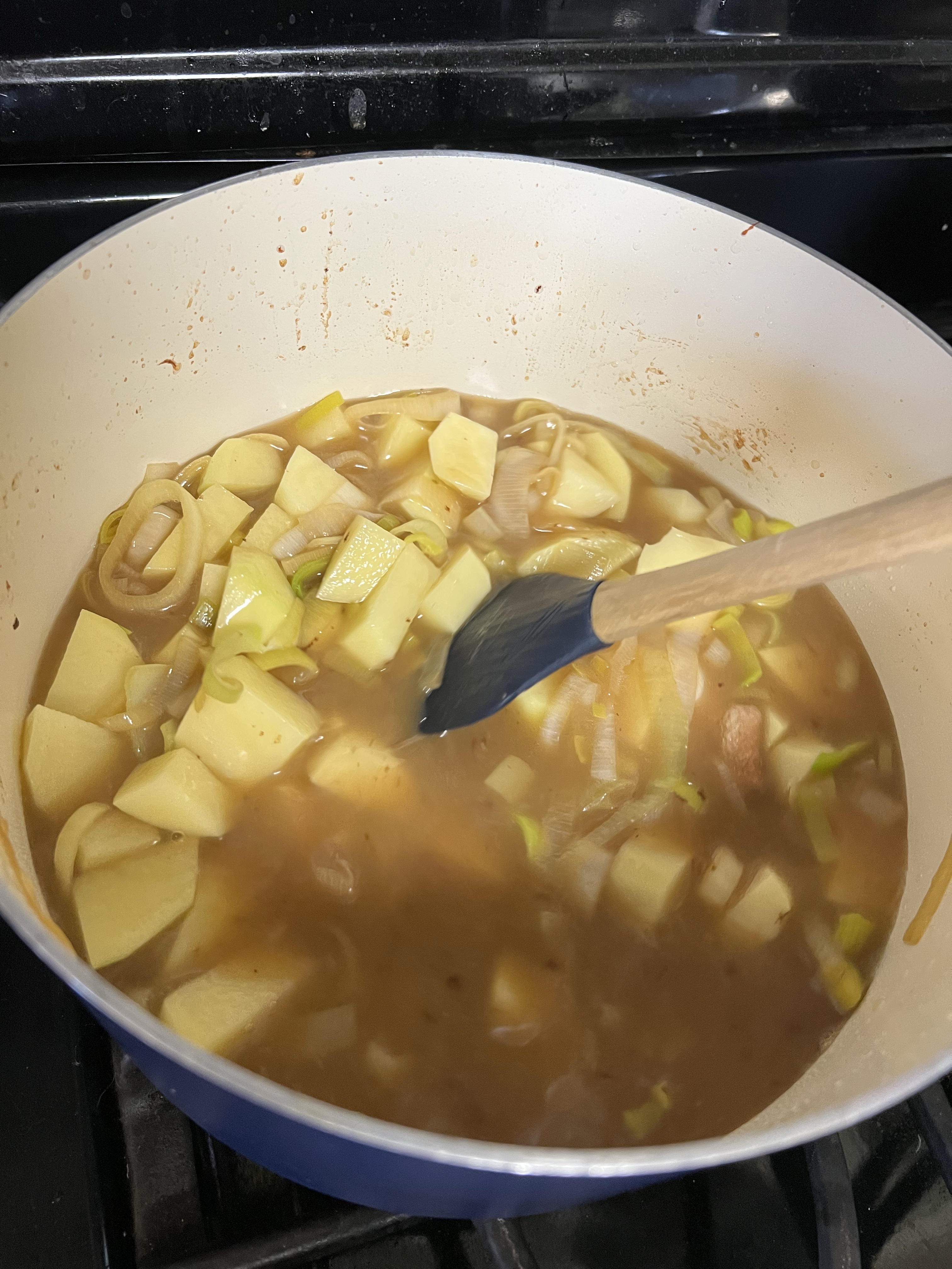 2. I added enough chicken bone broth to cover the bottom of the pot to help get up the bacon goodness. I then added my chopped leeks and cooked them a few minutes while I peels and chopped my potatoes.