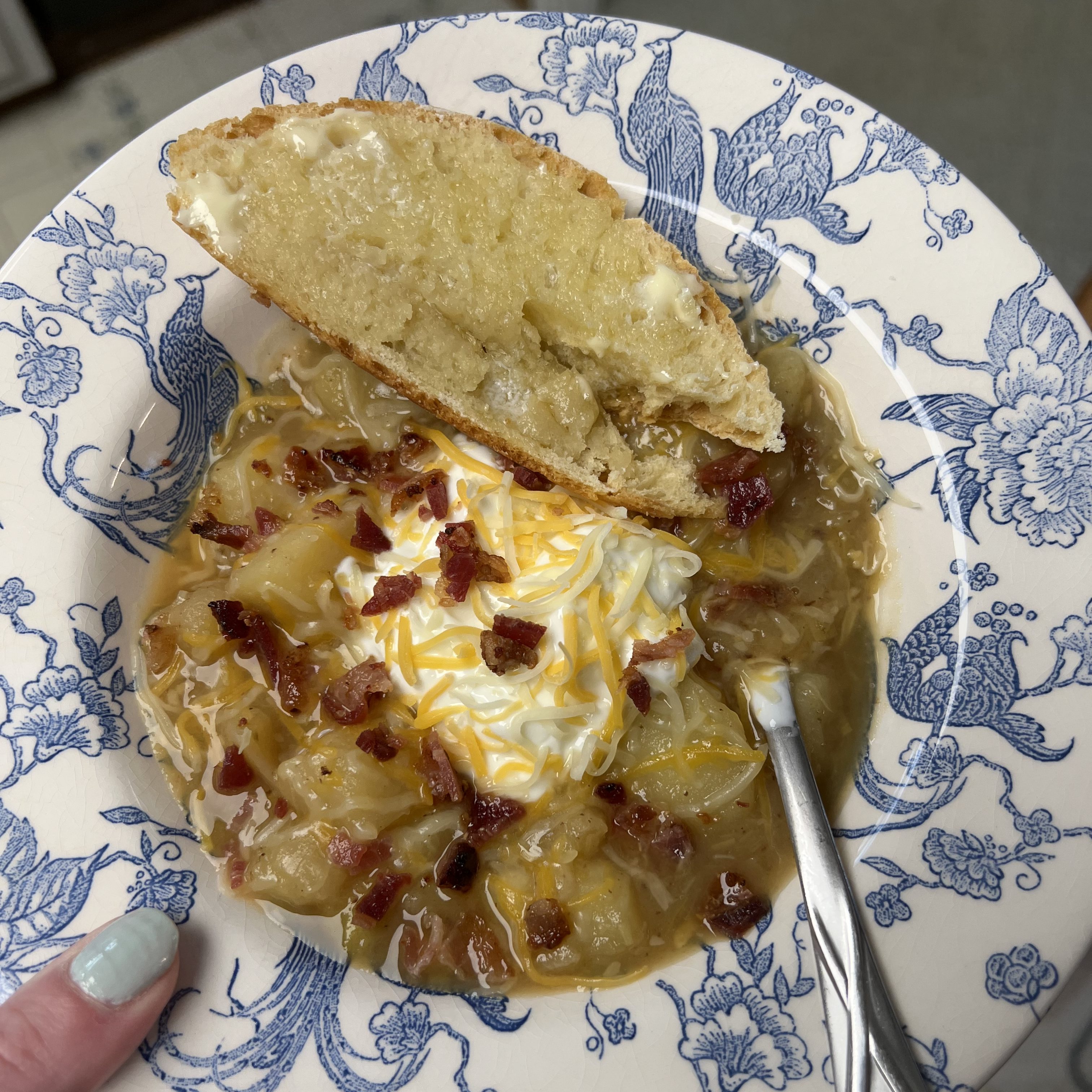 5. Serve hot with a sprinkling of that bacon, and your fav potato toppings. I also happen to have a sour dough starter and made a loaf to go with it too.