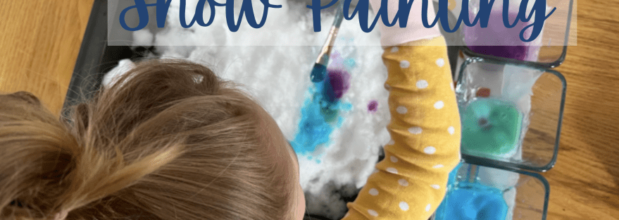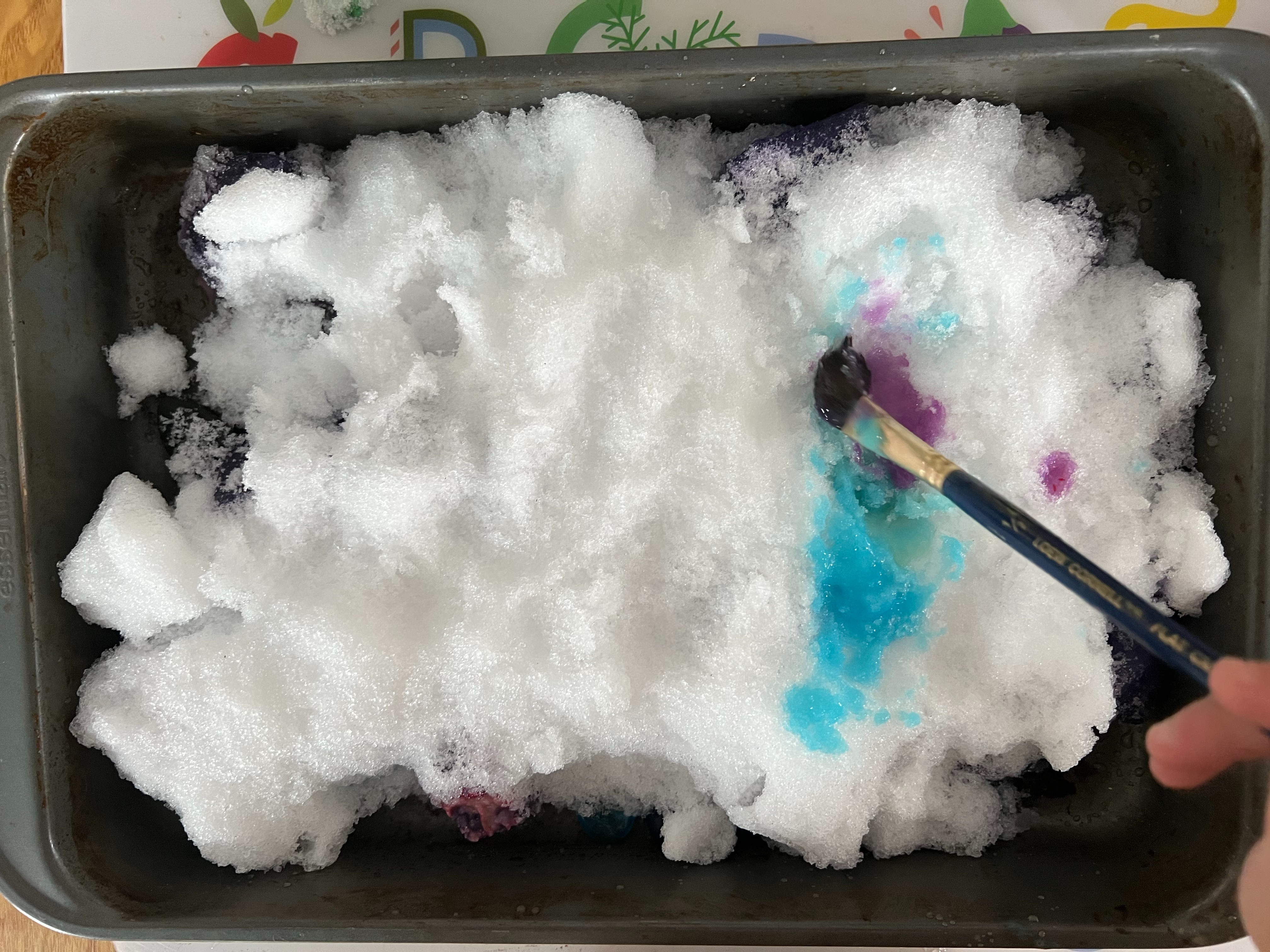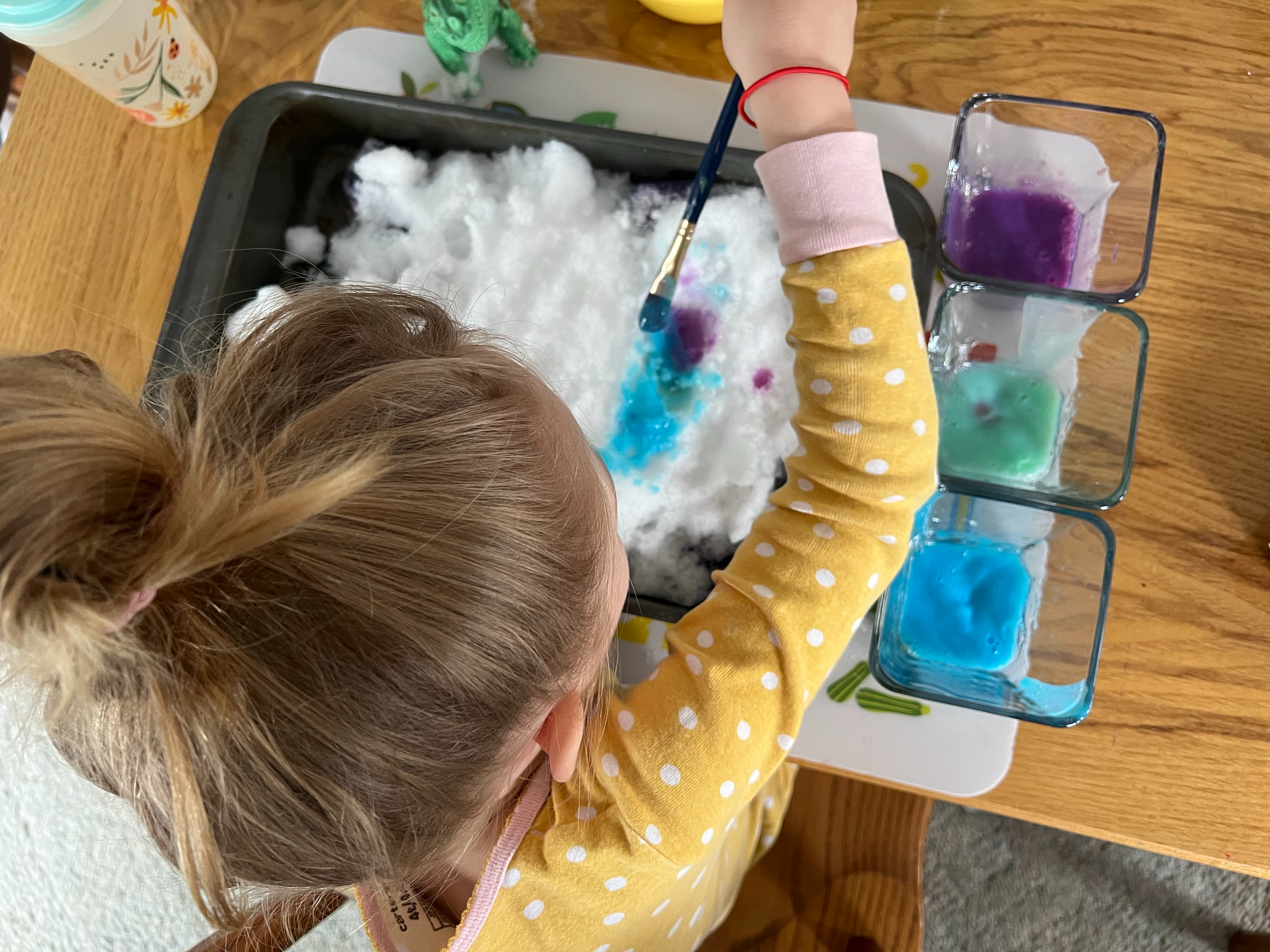 For some added play, I mixed a few of our bathtub paints with a bit of water for her to paint the snow. You could easily just dye water, mix some regular finger paints, add some color to body wash or something comparable for a similar effect.