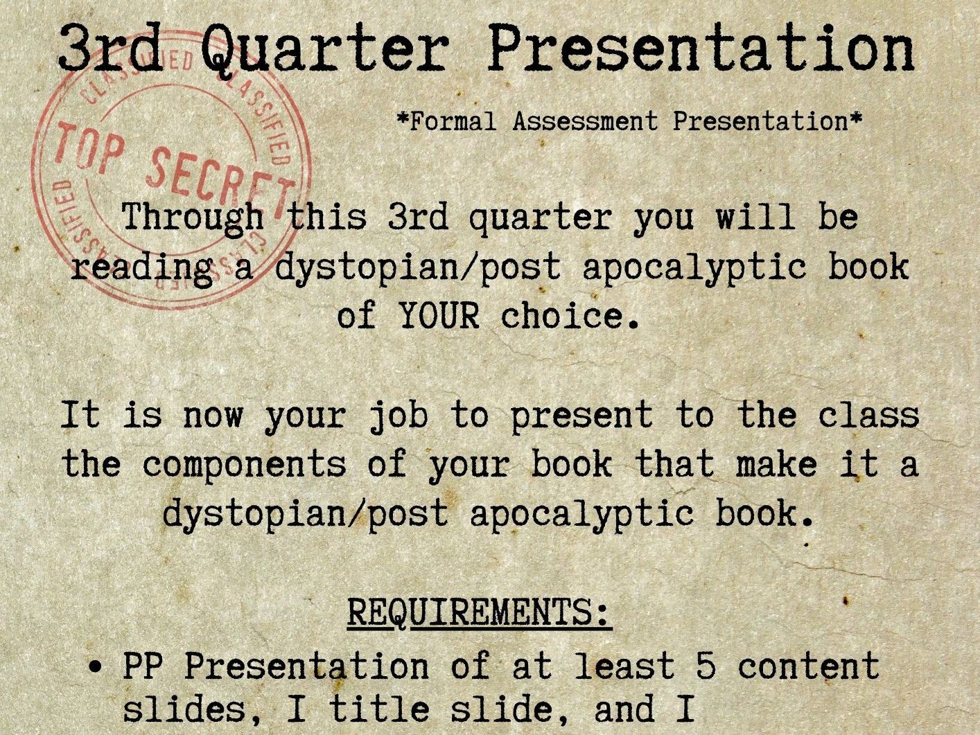 For the a presentation, I may want them to give me some historical context. Instead of ME talking at them about background info before we begin a book, it is way more fun for THEM to learn for themselves, and then teach each other. My own Austen/Bronte class just did presentations on topics like the Napoleonic Wars, Regency Culture, Why It’s Called the “Regency,” etc…. We’re now going into reading Pride & Prejudice with a whole lot more cultural understanding and context. In another class, they will be choosing a character to present on with the information: The name of the character, where they’re from, their job, how they interact with others, their general physical features/description, your assessment of the character: choose at least 3 lit crit glasses in which to view your character. Not only do they get a degree of grade for their actual presentation (pace, clarity of voice), and their presentation itself (slides, Prezi, etc), but the CONTENT and INFORMATION tell me they understand characterization; often times better than an essay may.