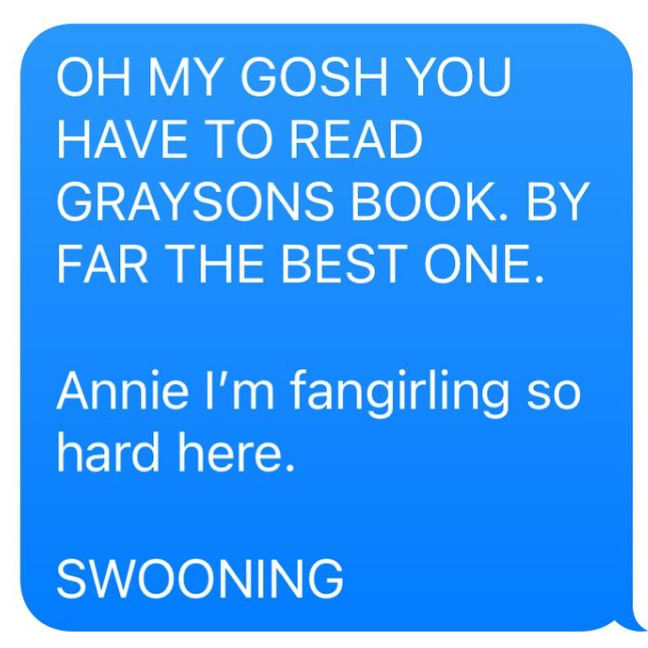 Annah Conwell- IRL-so kind! I love getting to chat with authors on the interwebs, and she’s one of my favs. I’ve also been reading through her books with a friend which has made them extra fun! She provides playlists that go with most of the books. I think Grayson’s is my favorite so far. I mean, honestly, the karaoke scene. MELTING.