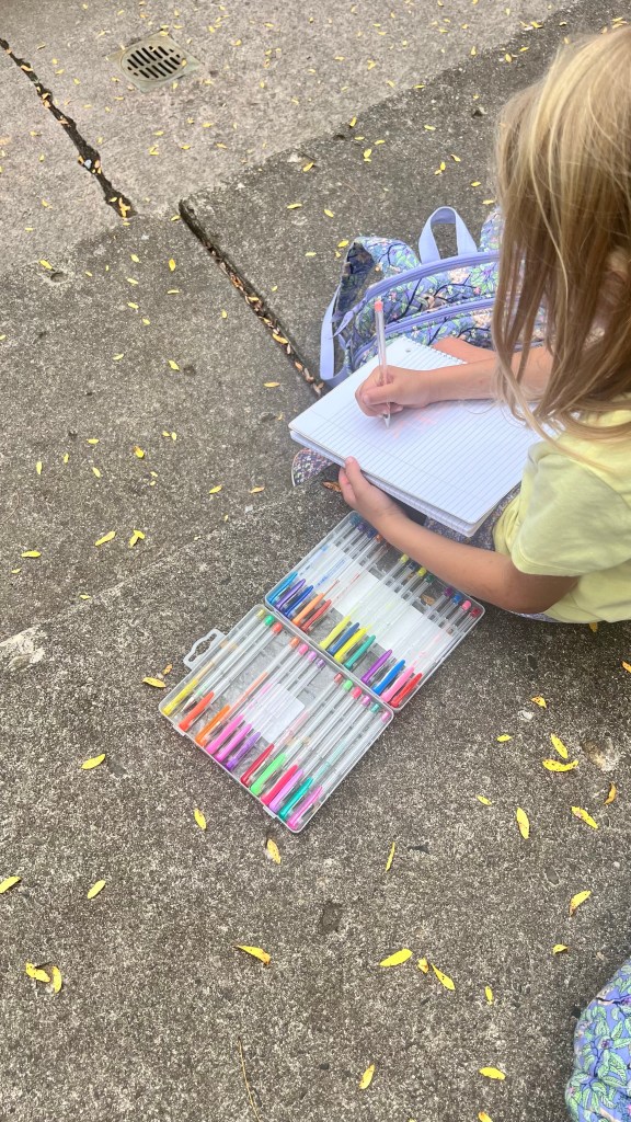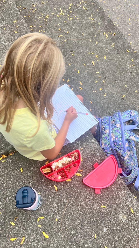 Nature Journals are something I’ve wanted to do forever, and I feel like the girls are finally at a place where they get it enough to really do! I got them each a notebook over the summer, and we started taking it with us to places like the zoo. On a separate piece of paper, Athena will dictate what she wants to write to go along with her drawing. When we get home, she adds her comments to the picture she did while we were out. This way we don’t get stuck sitting forever while she takes her time writing, she doesn’t feel rushed or get frustrated messing up, and she still gets to do her drawing there with the animals.