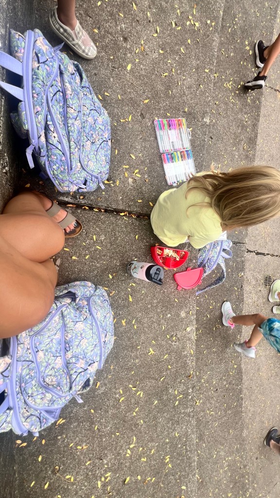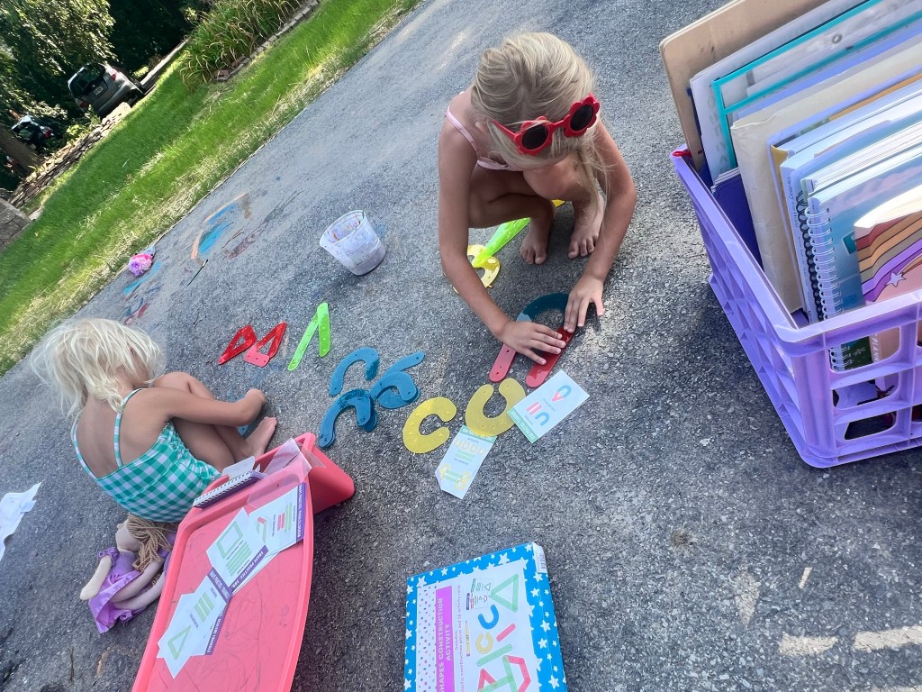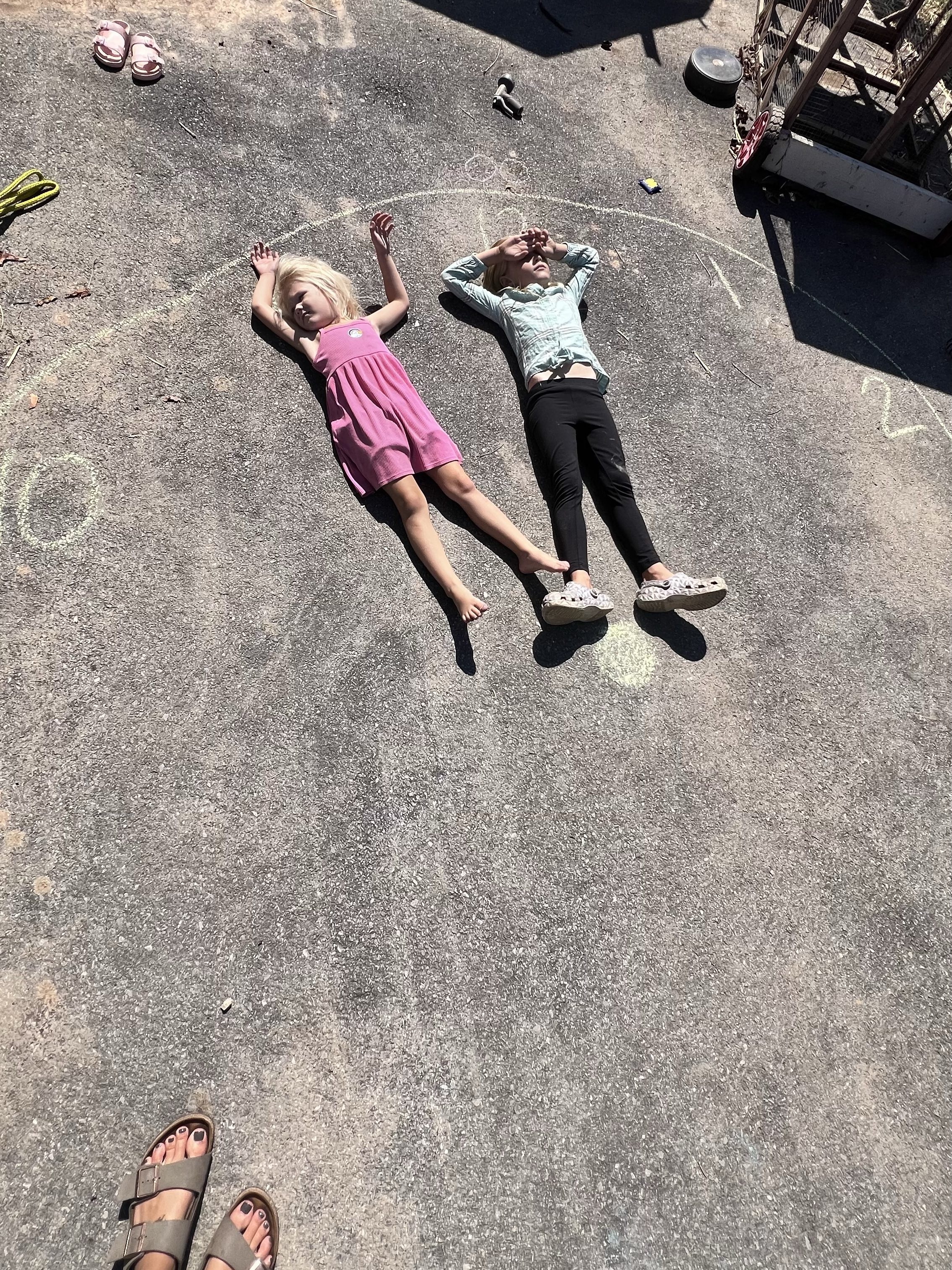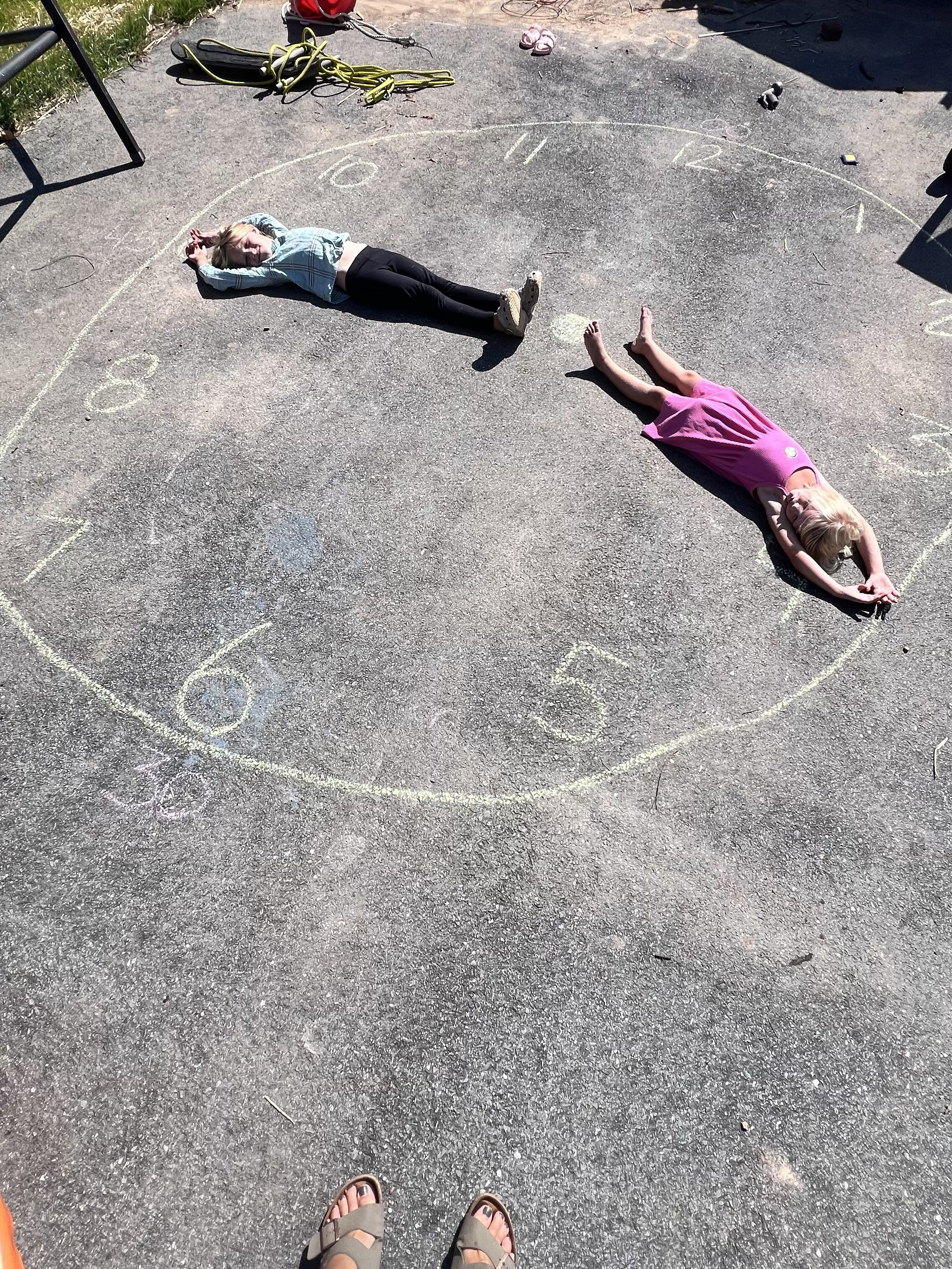 With an older sister and a younger sister, we had the PERFECT natural little hand and big hand for telling time. We’ve been working on reading a clock for a few weeks and this was a fun way to get Eleanor involved too. I drew a super sized clock on the drive way. I would tell the girls a time, and Athena would help Nora lay down as the hour hand, and Athena would then find her place as the minute hand. They giggled and had a blast the whole time that they were a clock.