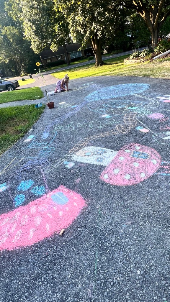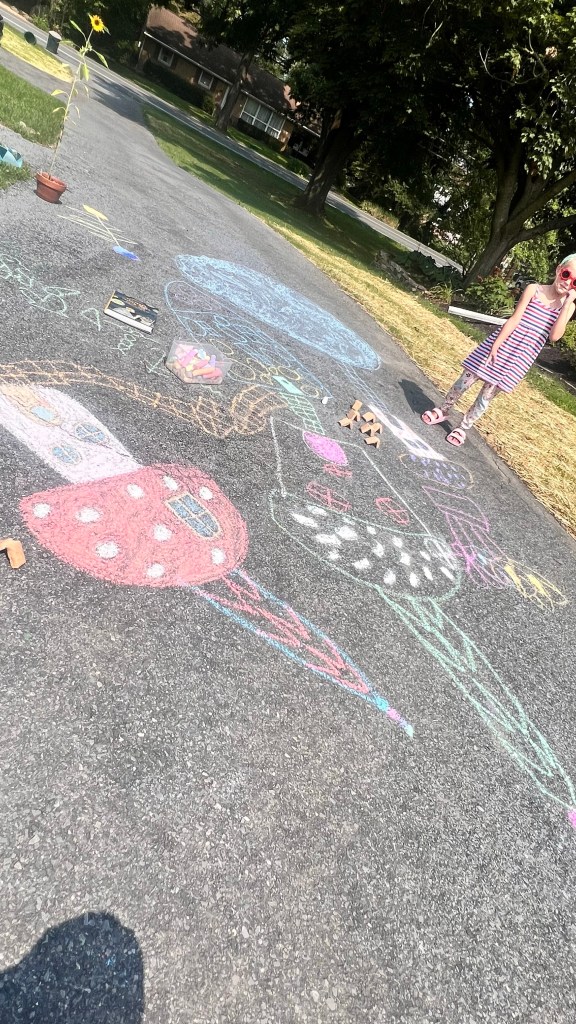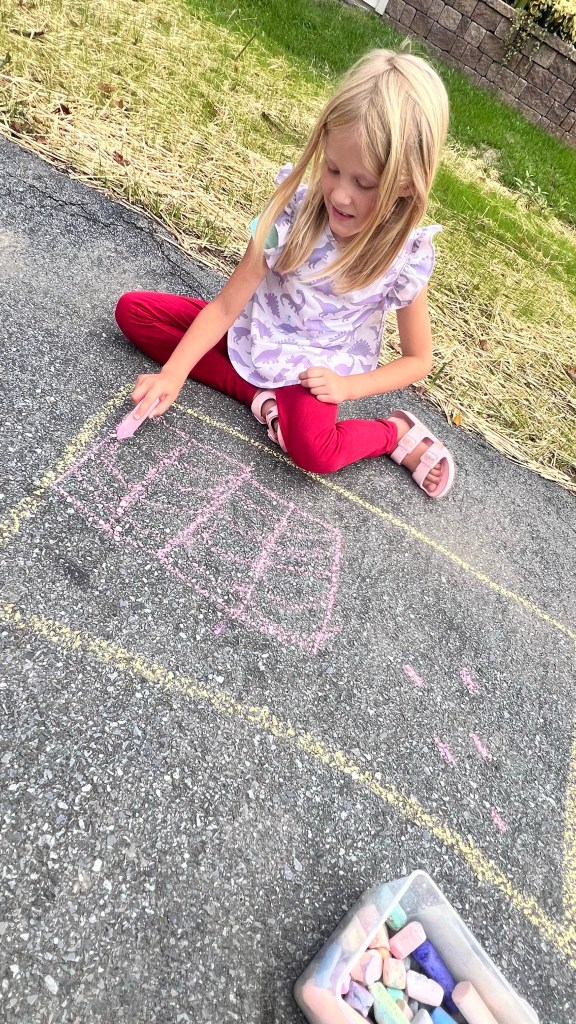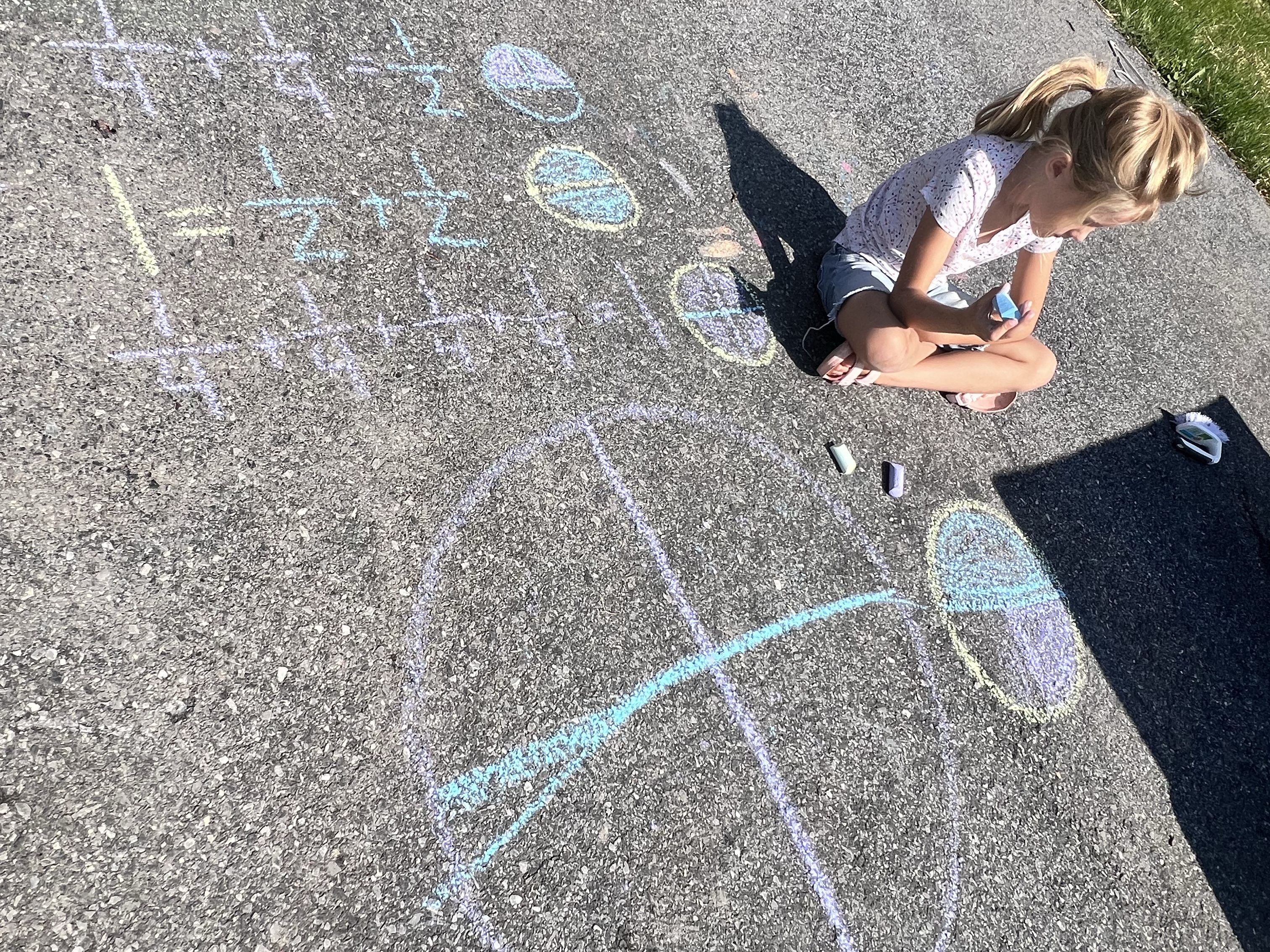 Chalk is also great for working on math and fractions. The various colors allow for easily color coding different components for easier identification. We drew pies. Whole pies to be exact. THEN, we drew a line down the middle in a different color for halves. A third color gave us quarters. A different pie, and different colors, taught us thirds. Macro coloring on the driveway made for fun, AND easily identifiable concepts because it was all color coded.