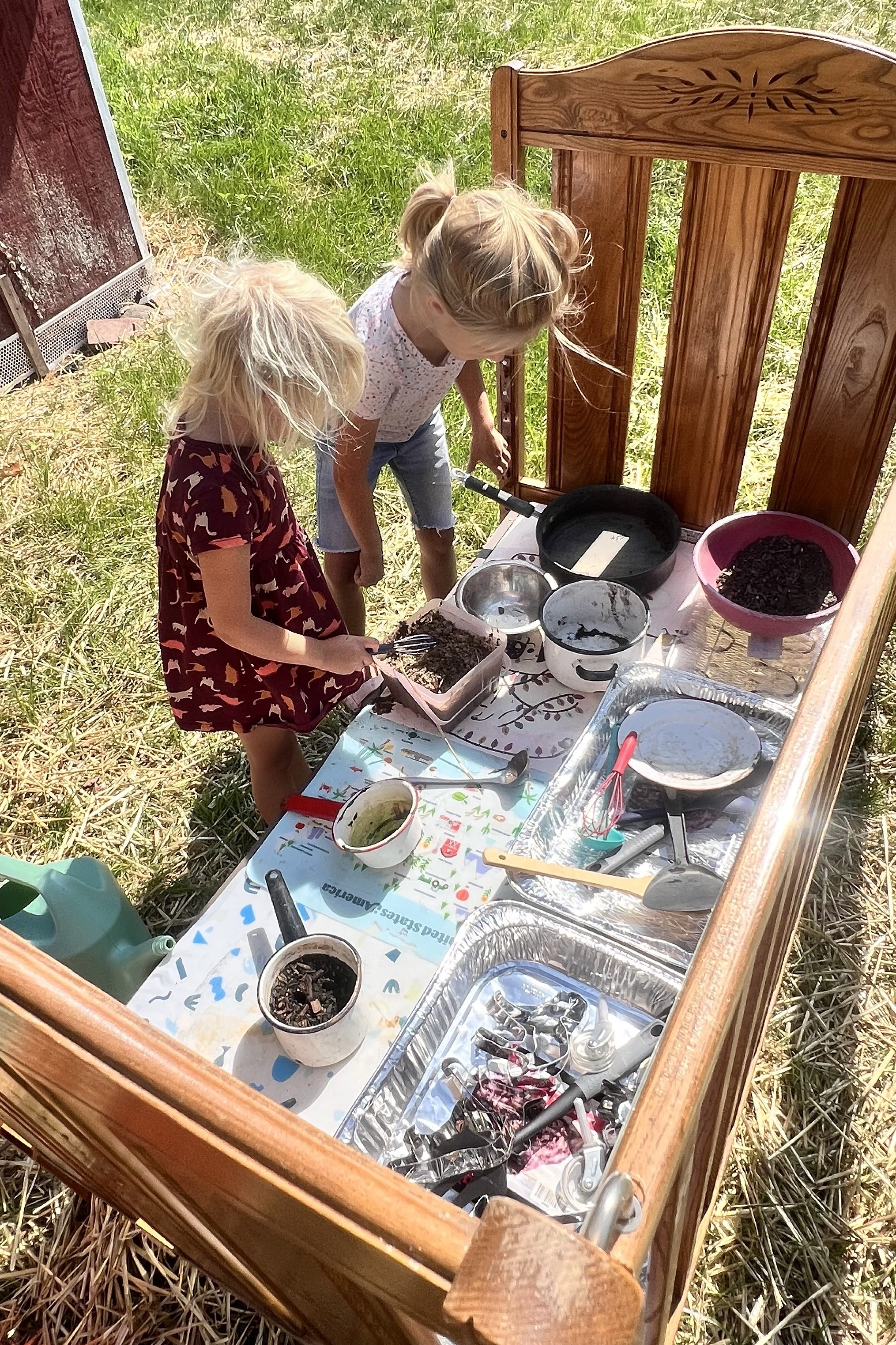 RIP to the OG Mud Kitchen. After a few years of being outside, and being VERY well loved, it quite literally went to the trash. I am so thankful that over the summer a kind friend passed on the crib they’re no longer using. The plus to this is that it’s a full sized crib, not a mini like our original, so there is enough room for both girls to stand and work! They find rocks, flowers, walnuts, random berries, leaves, and whatever else they can get their hands on to bake in the mud kitchen. Hand me downs, Dollar Store, & thrift stores are the best way to get outdoor cooking gear. Double bonus- the boys across the street love to come over and play at the mud kitchen too.